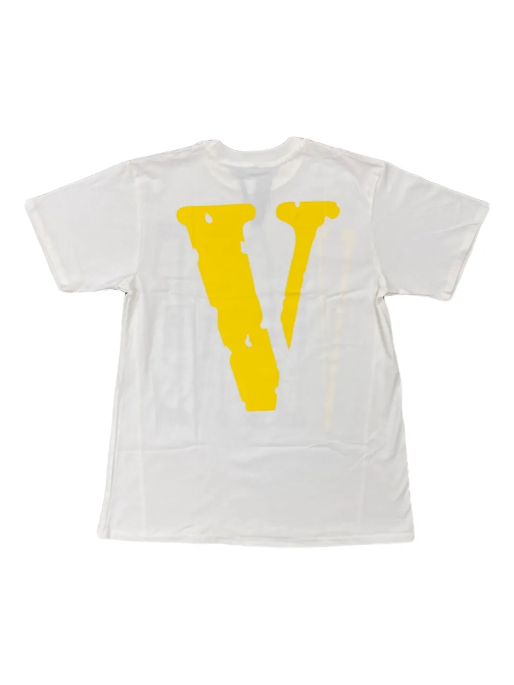 Белый графический принт Vlone, короткие рукава, круглый вырез горловины, желтая V-образная графика на спине, черно-желтая надпись Vlone спереди.