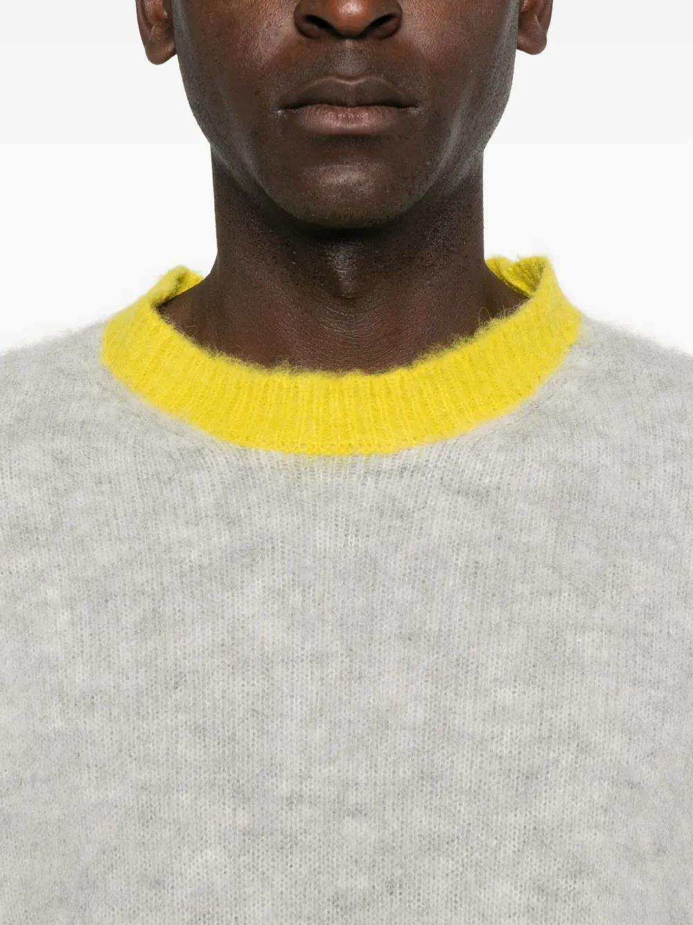Серая матовая текстура, желтая отделка, круглый вырез, длинные рукава, ребристые манжеты и подол.