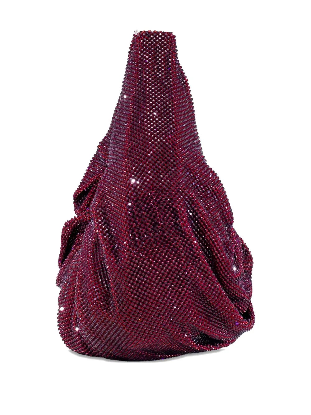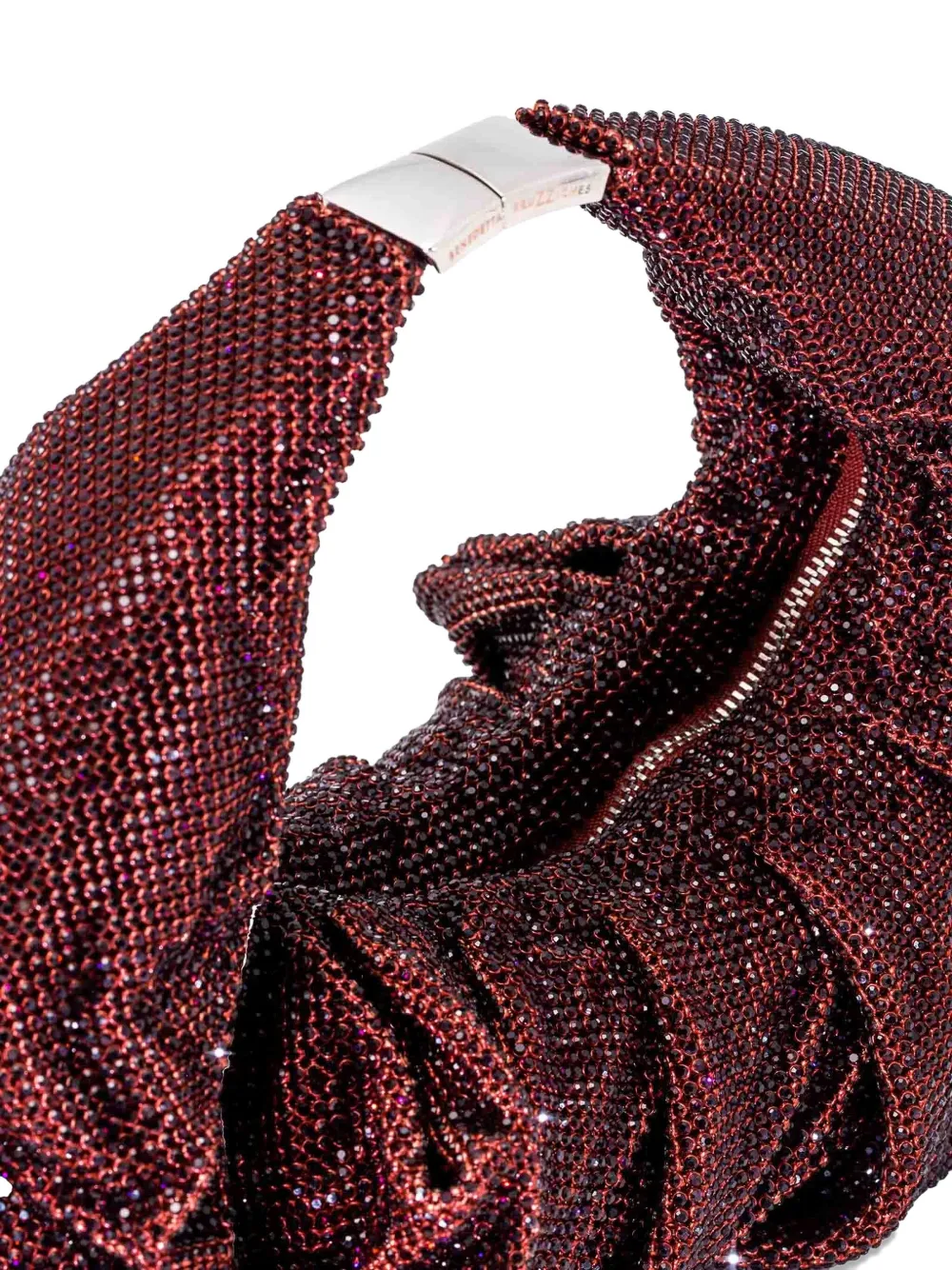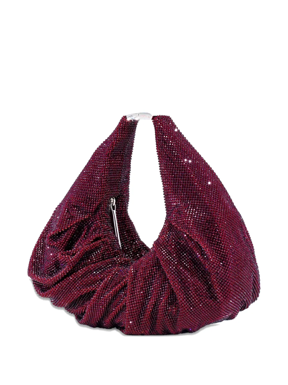 Украшение из фиолетовых кристаллов, драпированный дизайн, верхняя ручка, застежка-молния, изогнутый силуэт.