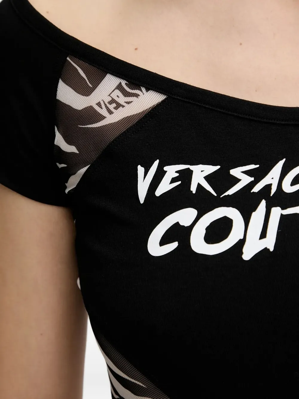 Черная зебровая сетка с вставками, вырезами, короткими рукавами, вырезом-лодочкой, логотипом и принтом.
