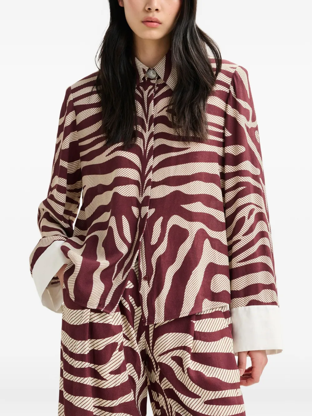 Длинные рукава с принтом красной зебры, закругленный подол, воротник-поло, застежка на пуговицы.