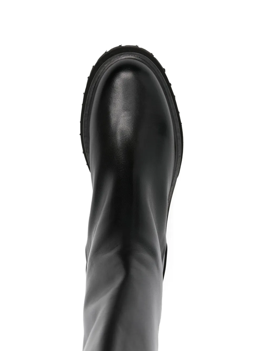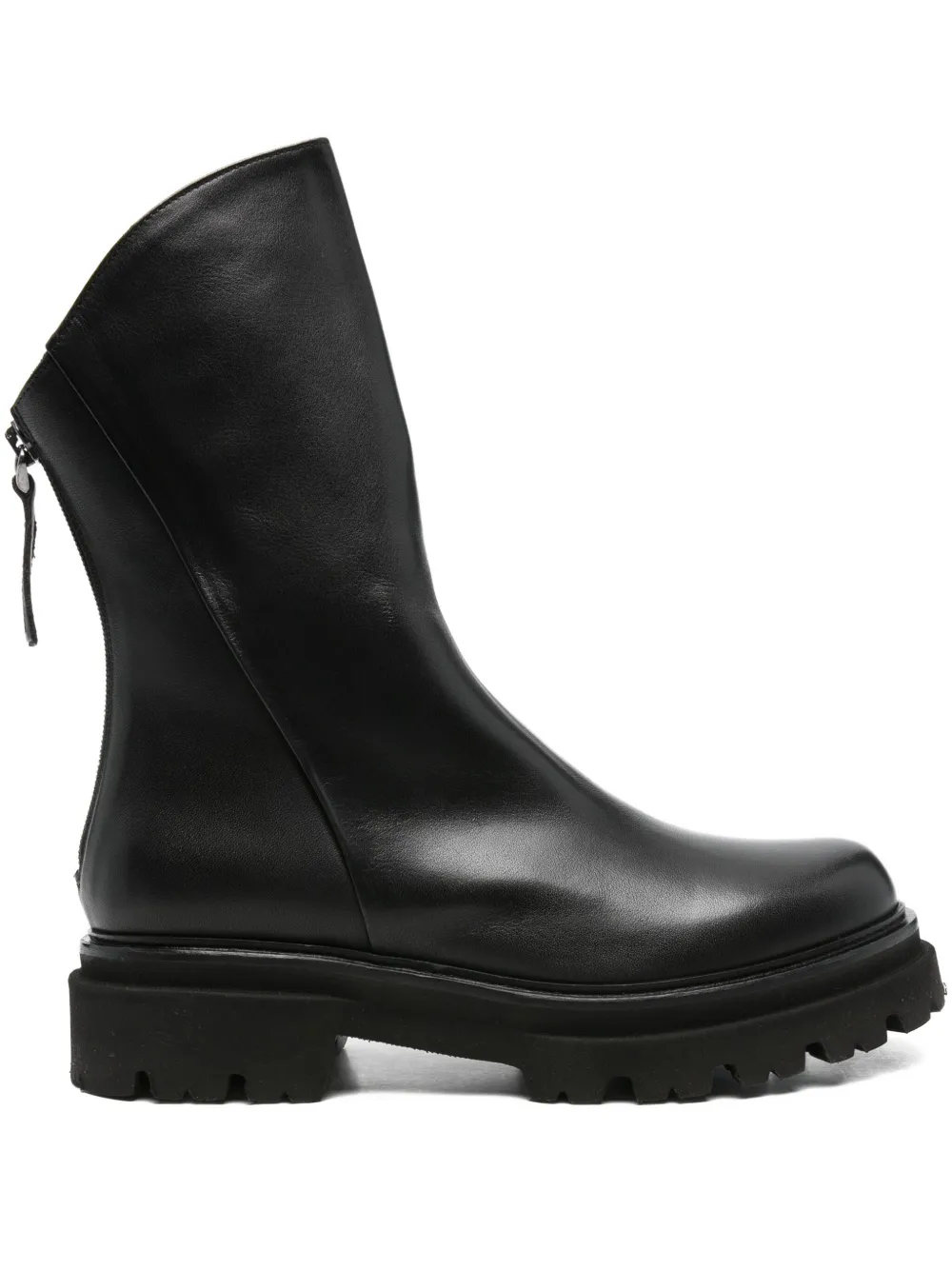 Верх из черной кожи, застежка-молния сзади, платформа, круглый носок, массивная резиновая подошва.