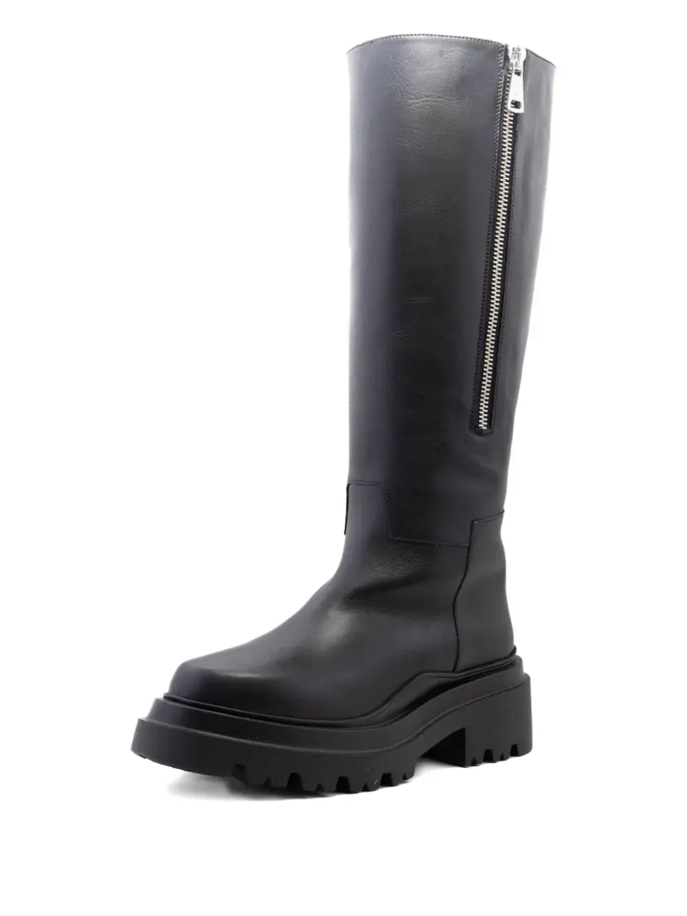 Верхняя часть из черной кожи, застежка-молния сбоку, подошва на платформе, голенище до колена