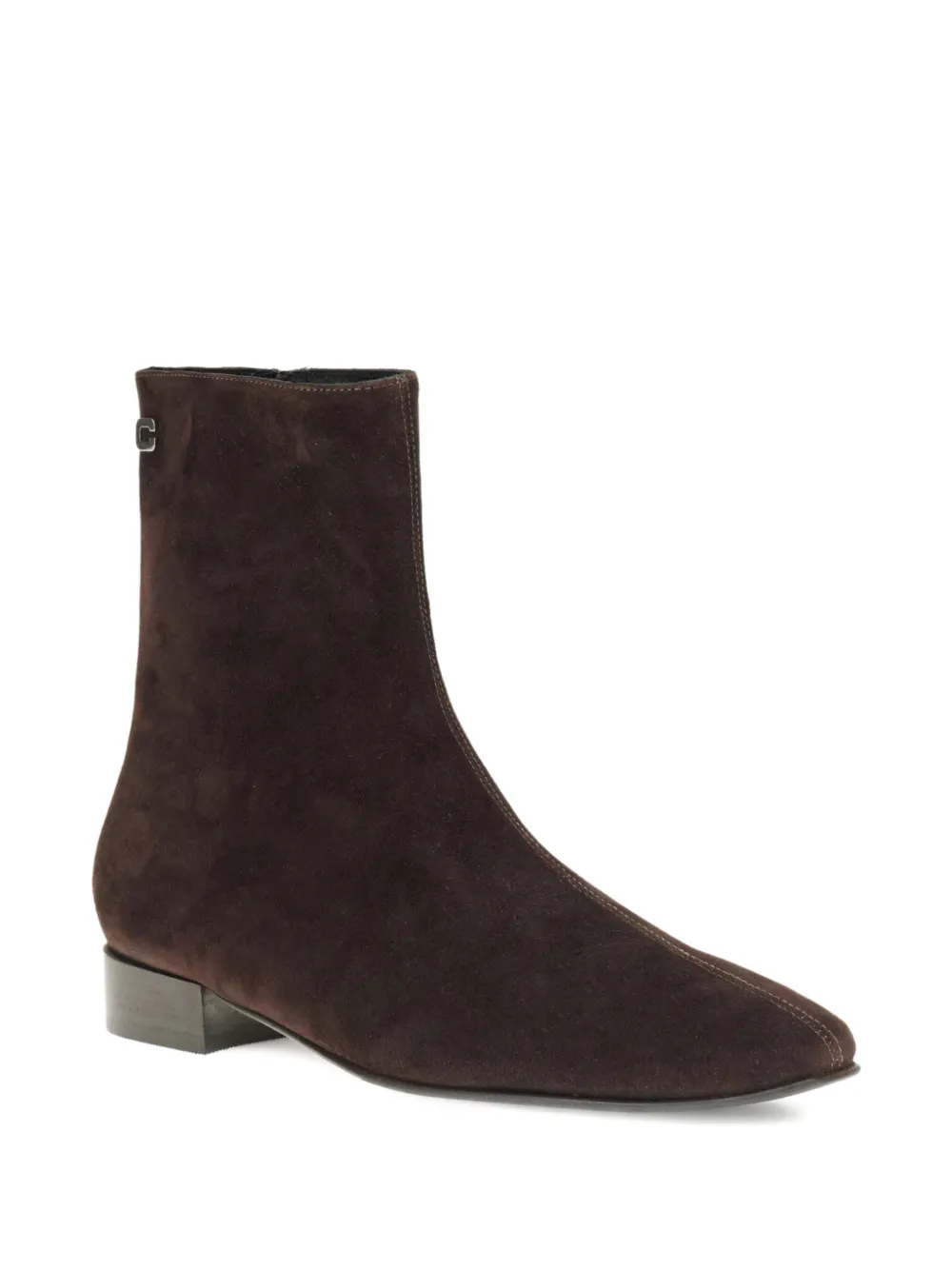 Верх из коричневой замши, острый носок, высота до щиколотки, застежка-молния сзади, низкий блочный каблук