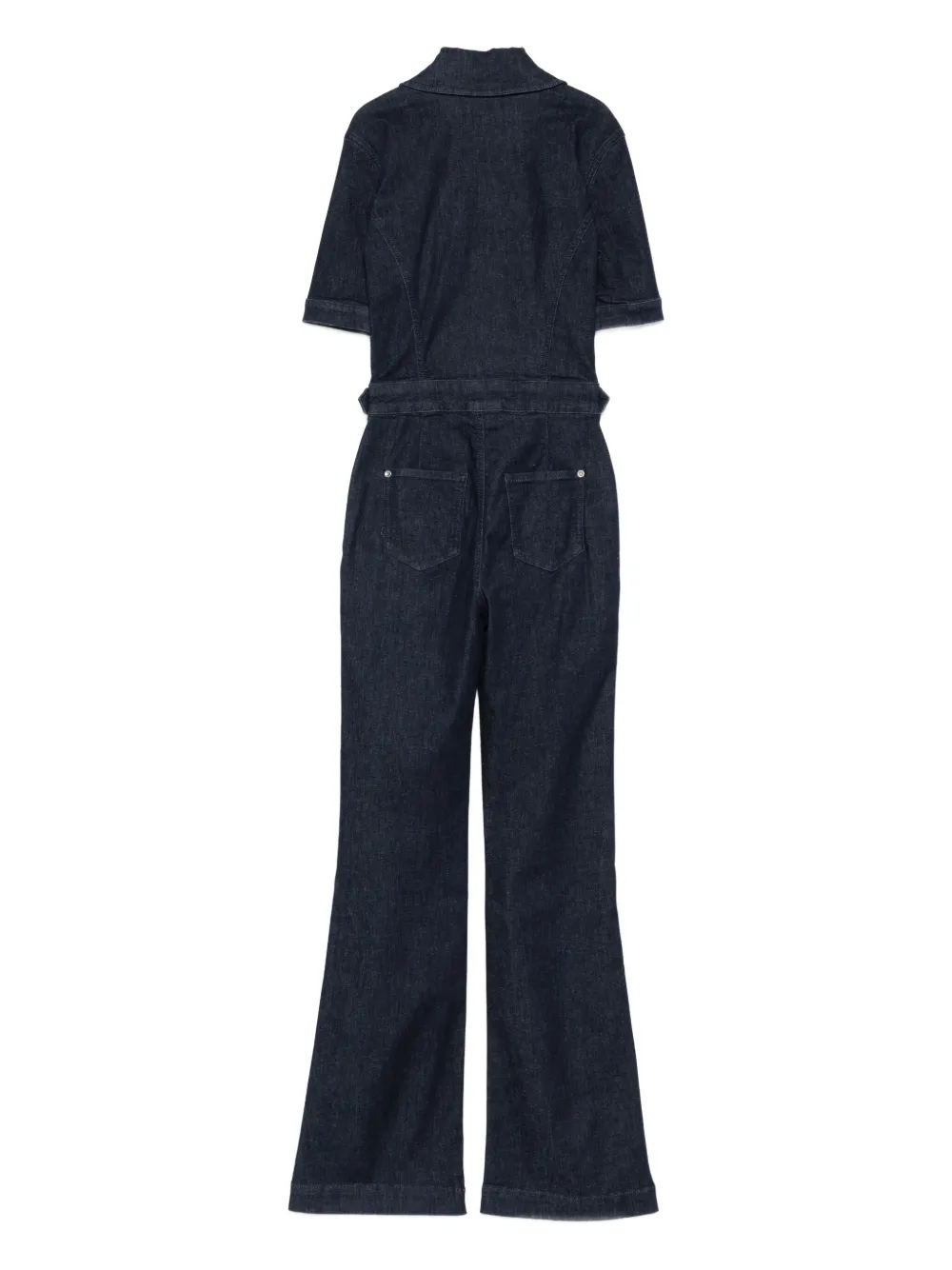 Сине-окрашенный, короткие рукава, застежка-молния спереди, деталь с пряжкой, прорезные карманы, расклешенные штанины