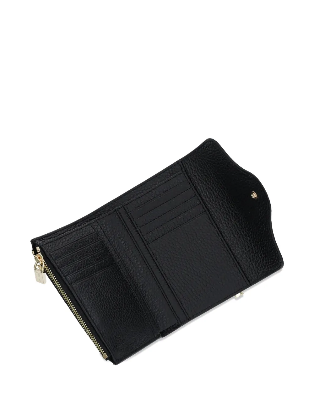 Черная шагреневая кожа, золотистый логотип, застежка-молния, несколько отделений для карт, внутренние отделения