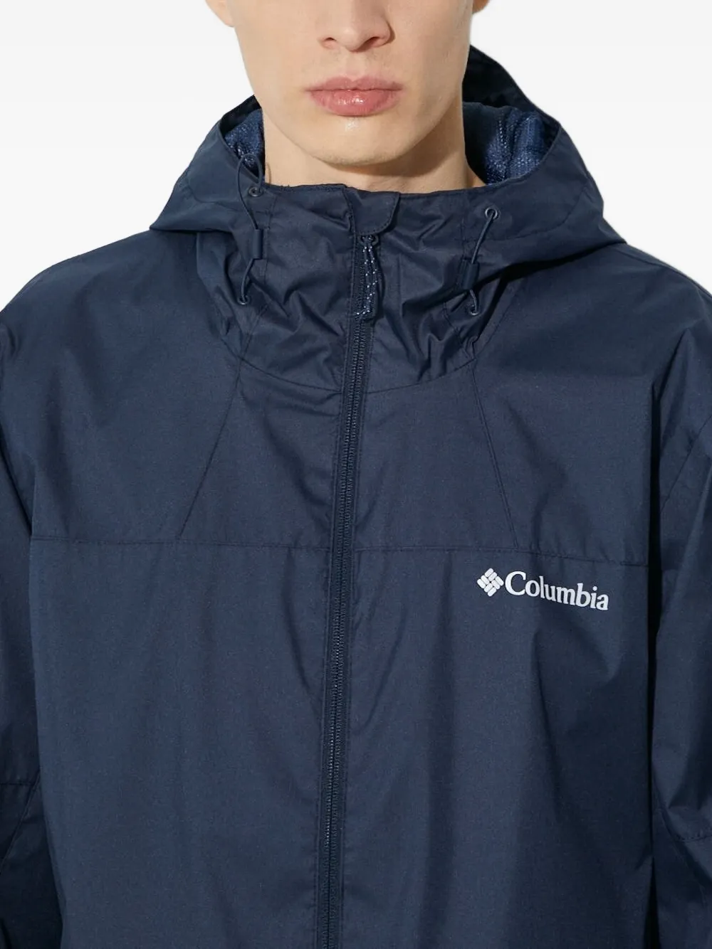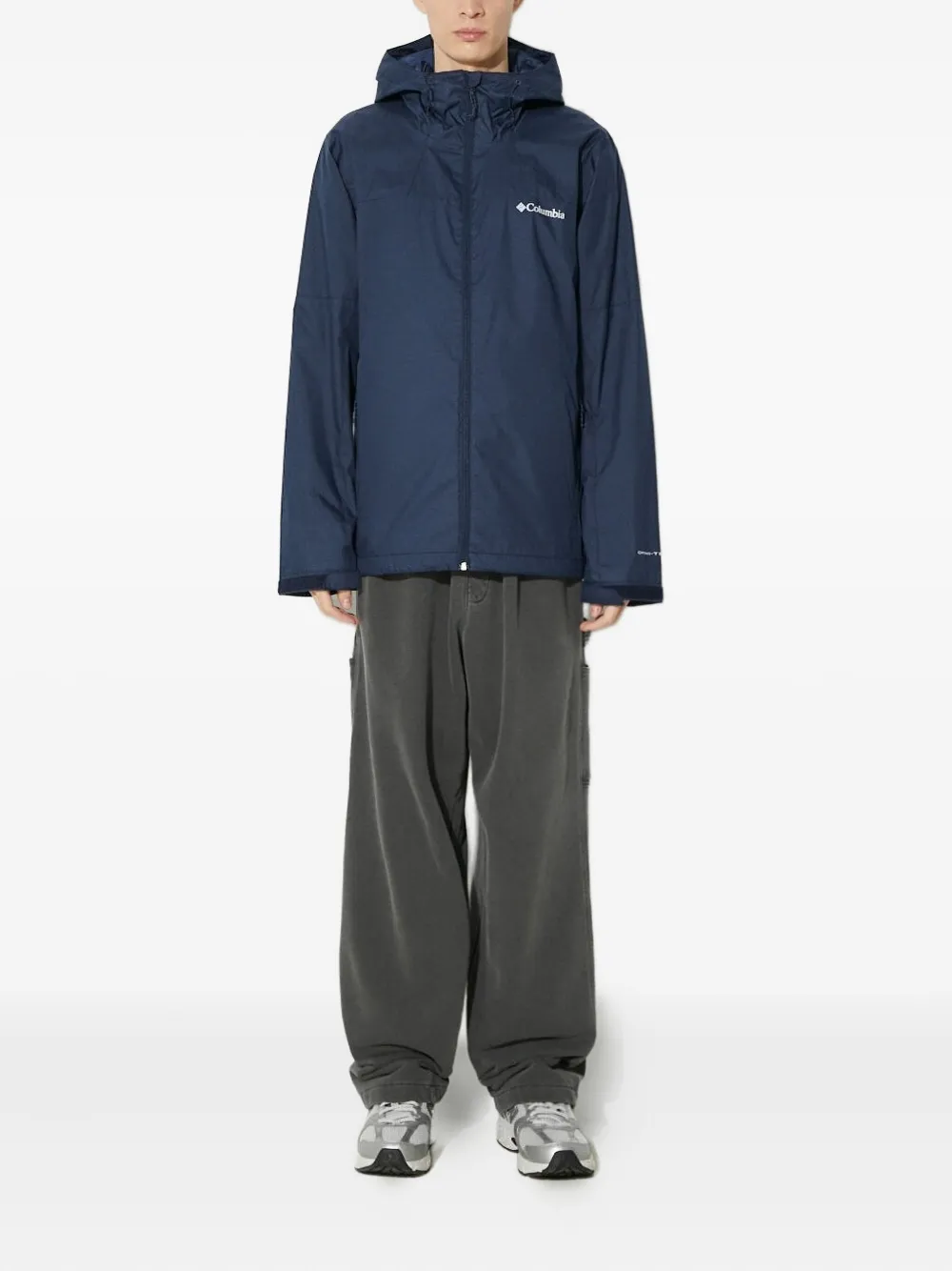 Темно-синяя застежка-молния, регулируемые манжеты, пришитый капюшон.