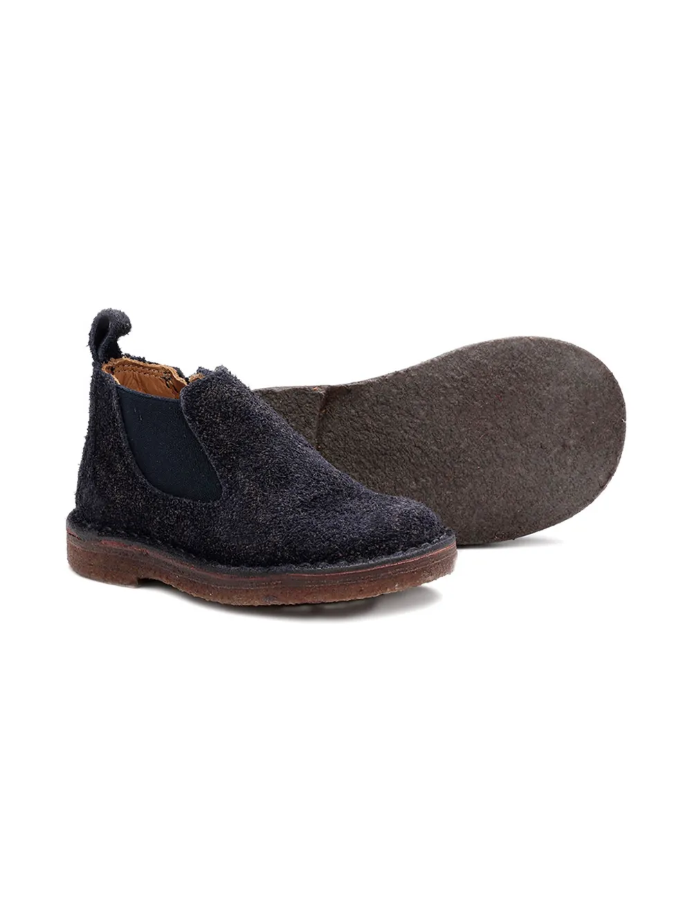 Темно-синие замшевые эластичные боковые панели, застежка-молния сбоку, круглый носок, плоская подошва.