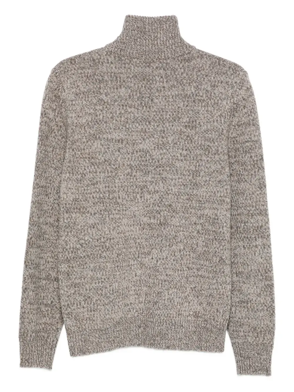 Коричневый шерстяной свитер с высоким воротом, застежкой-молнией, длинными рукавами, ребристыми манжетами и ребристым подолом.