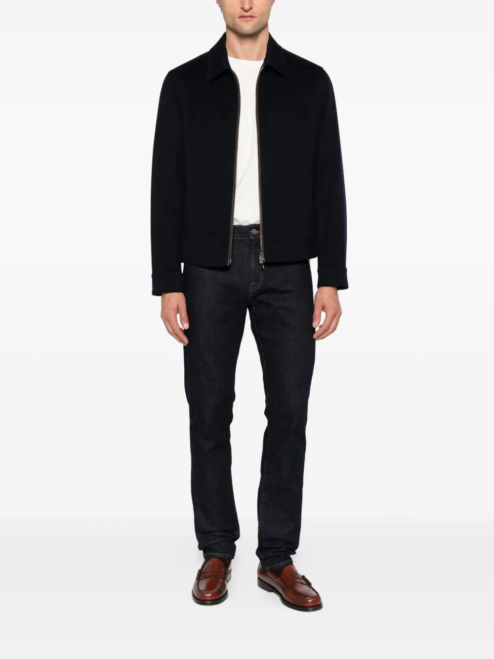 Материал: темно-синяя шерсть, застежка-молния, прорезные карманы, воротник-стойка, длинные рукава.