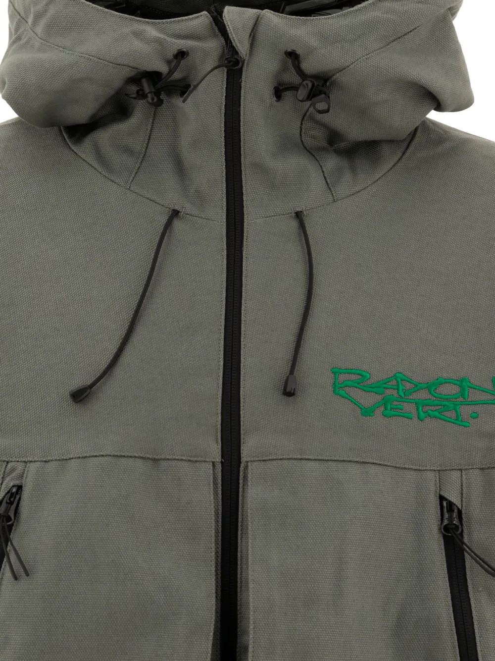 Серый капюшон на шнурке, застежка на молнию, боковые карманы на молнии, вышитый логотип.