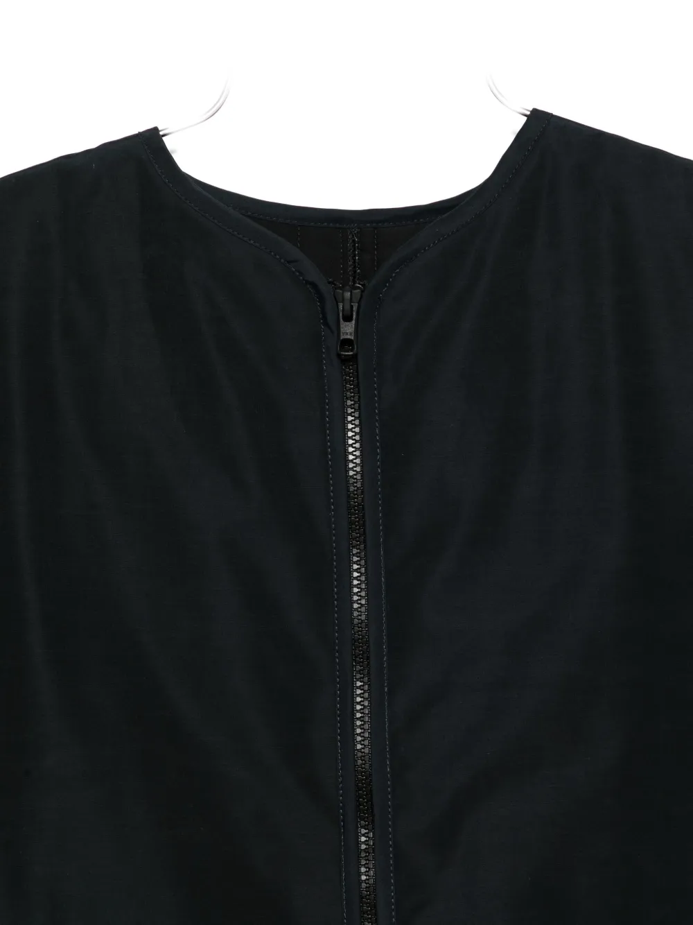 Темно-синяя застежка-молния, накладные карманы, круглый вырез, короткие рукава.