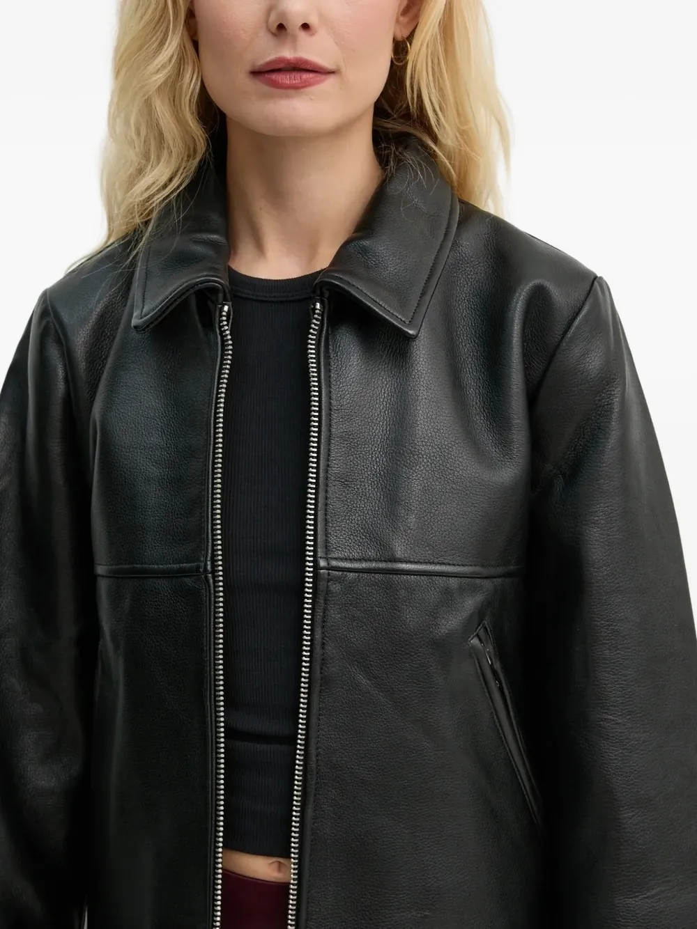 Черная кожаная конструкция, застежка-молния, классический воротник, карманы на молнии, прямой подол.