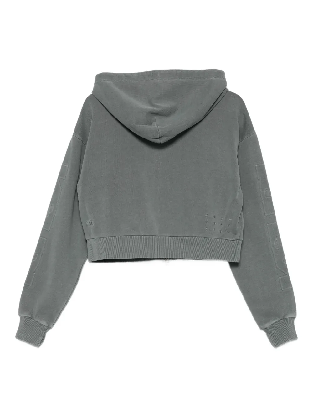 Серый хлопок, застежка-молния по всей длине, логотип на рукавах, укороченный капюшон на шнурке