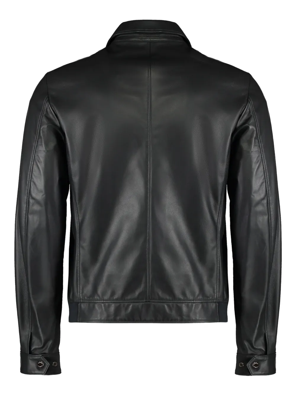 Черная телячья кожа, карманы на молнии, застежка на кнопки, воротник-стойка, прямой подол