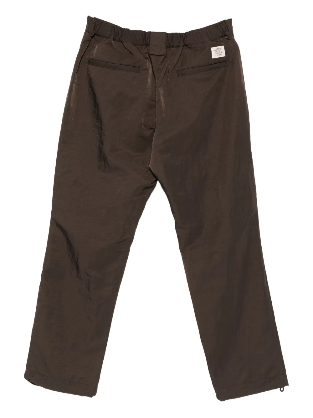 Коричневые брюки с двумя боковыми карманами на молнии, эластичным поясом сзади, прямыми штанинами, застежкой на пуговицы спереди, логотипом сзади.