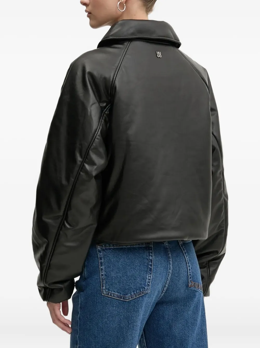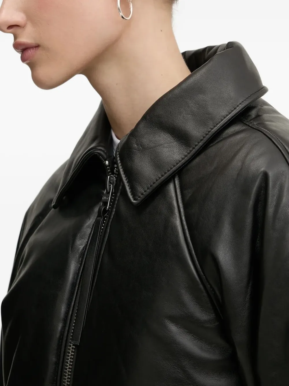 Черная кожаная застежка-молния спереди, длинные рукава.