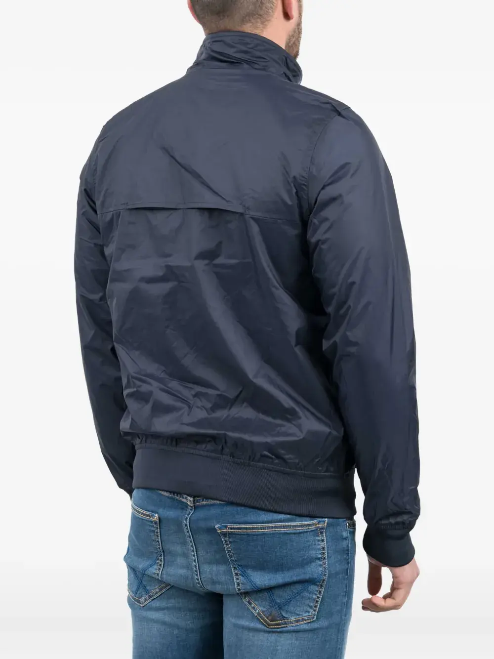 Темно-синие ребристые манжеты, застежка-молния, воротник-стойка, боковые карманы.