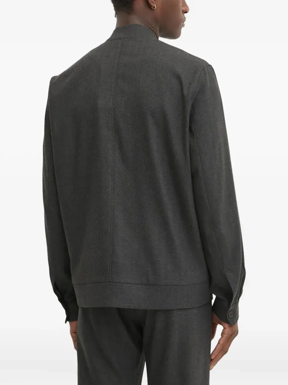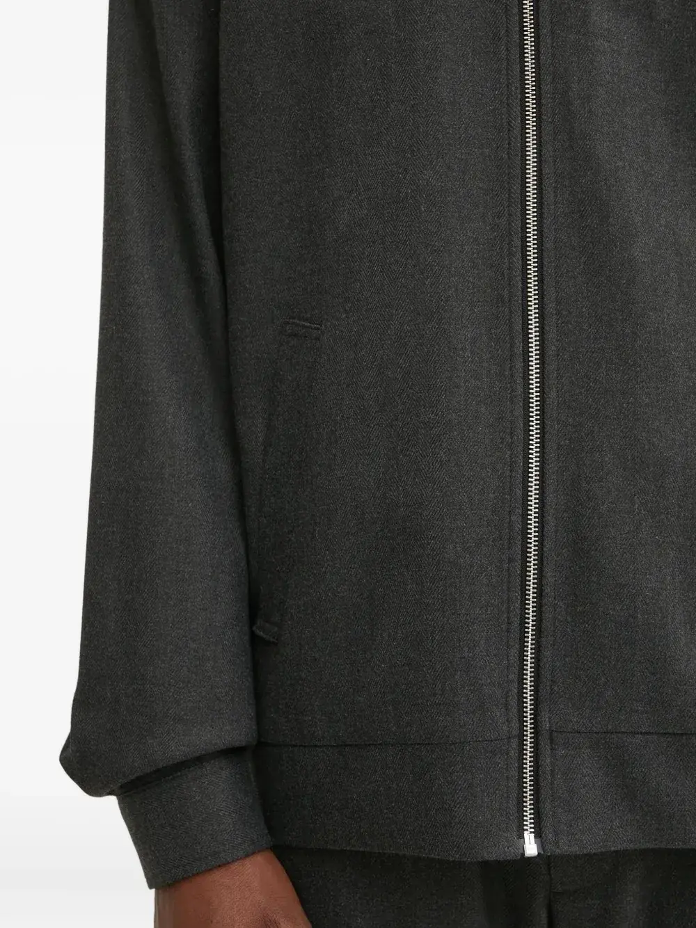 Серая застежка-молния спереди, длинные рукава, прорезные карманы по бокам.