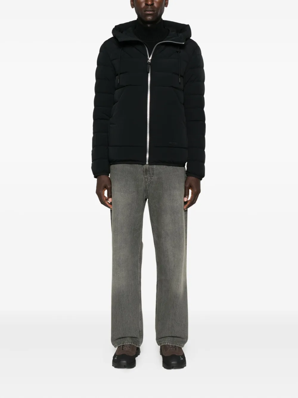 Черный стеганый дизайн, застежка-молния спереди, капюшон на шнурке, длинные рукава, боковые карманы с листочкой