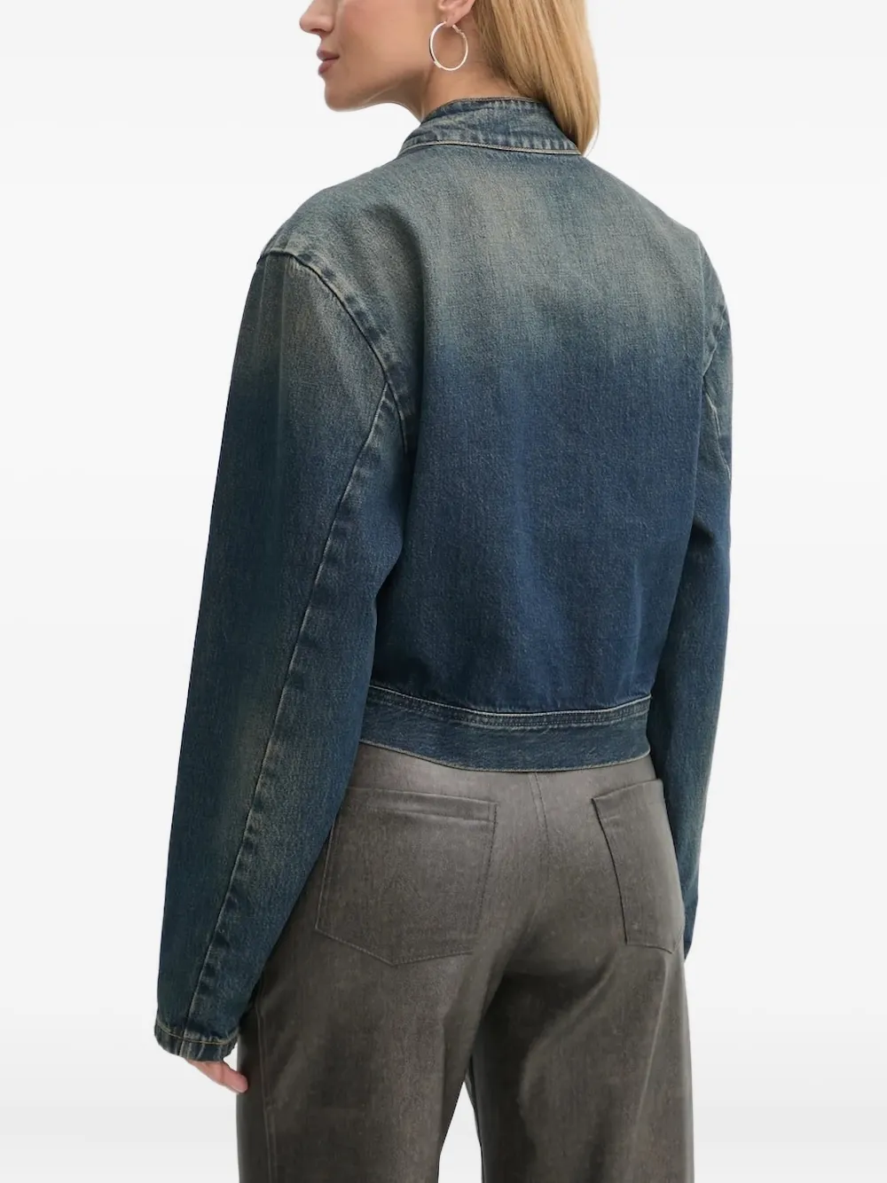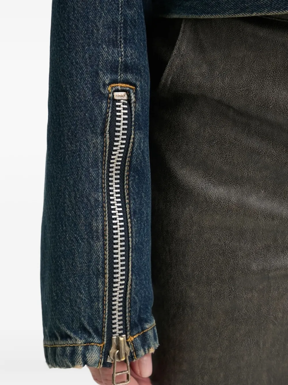 Темно-синяя застежка-молния спереди, молнии на манжетах, воротник-стойка, укороченные длинные рукава.