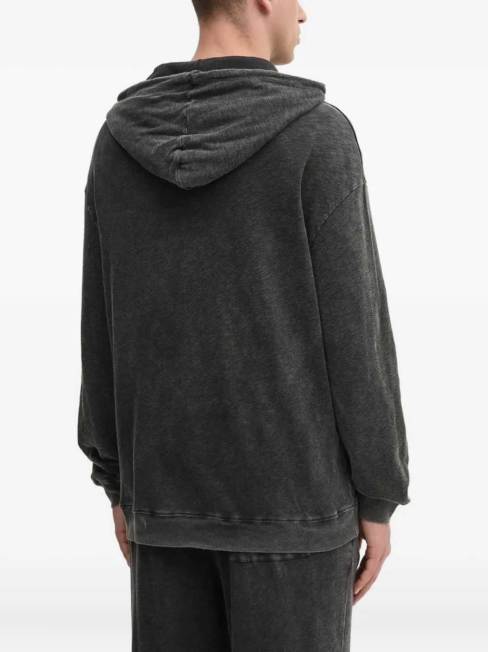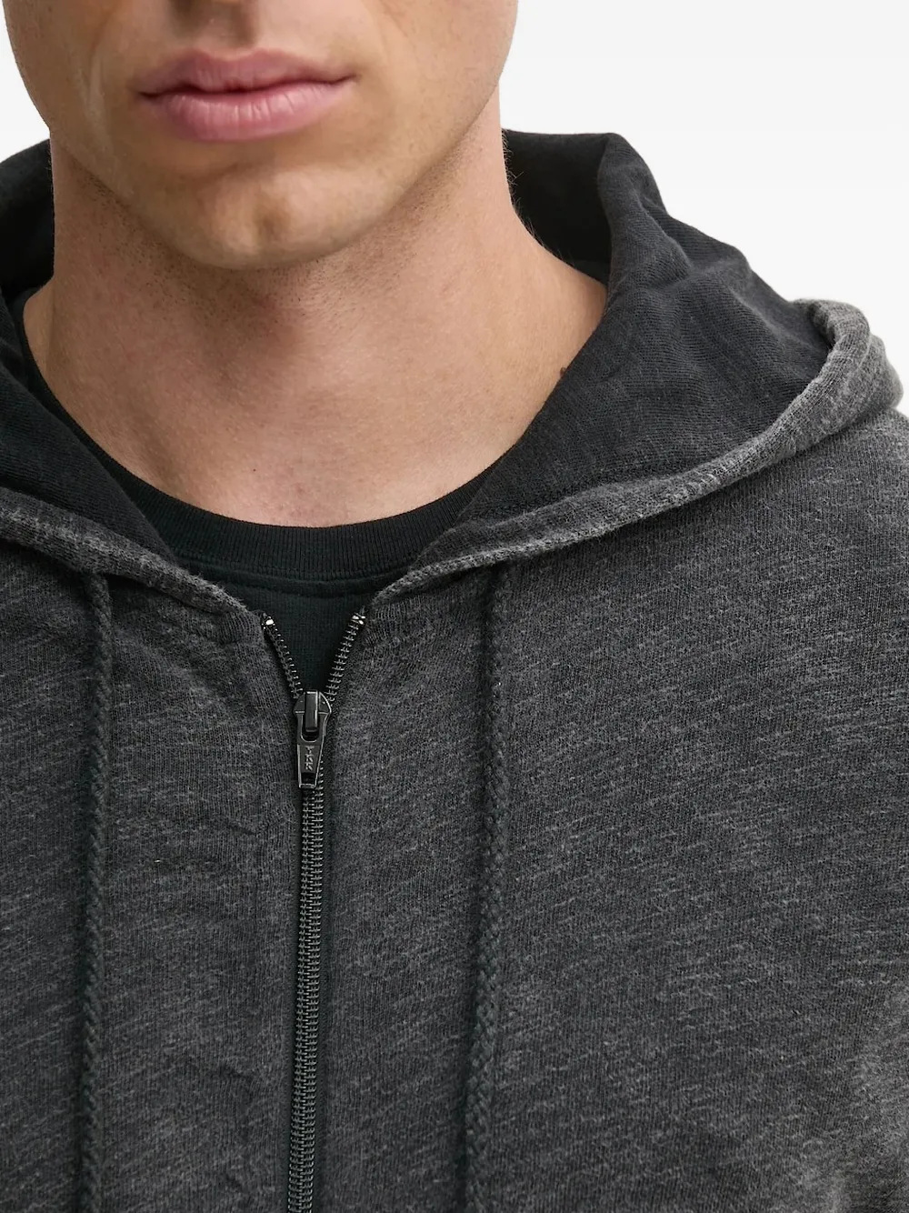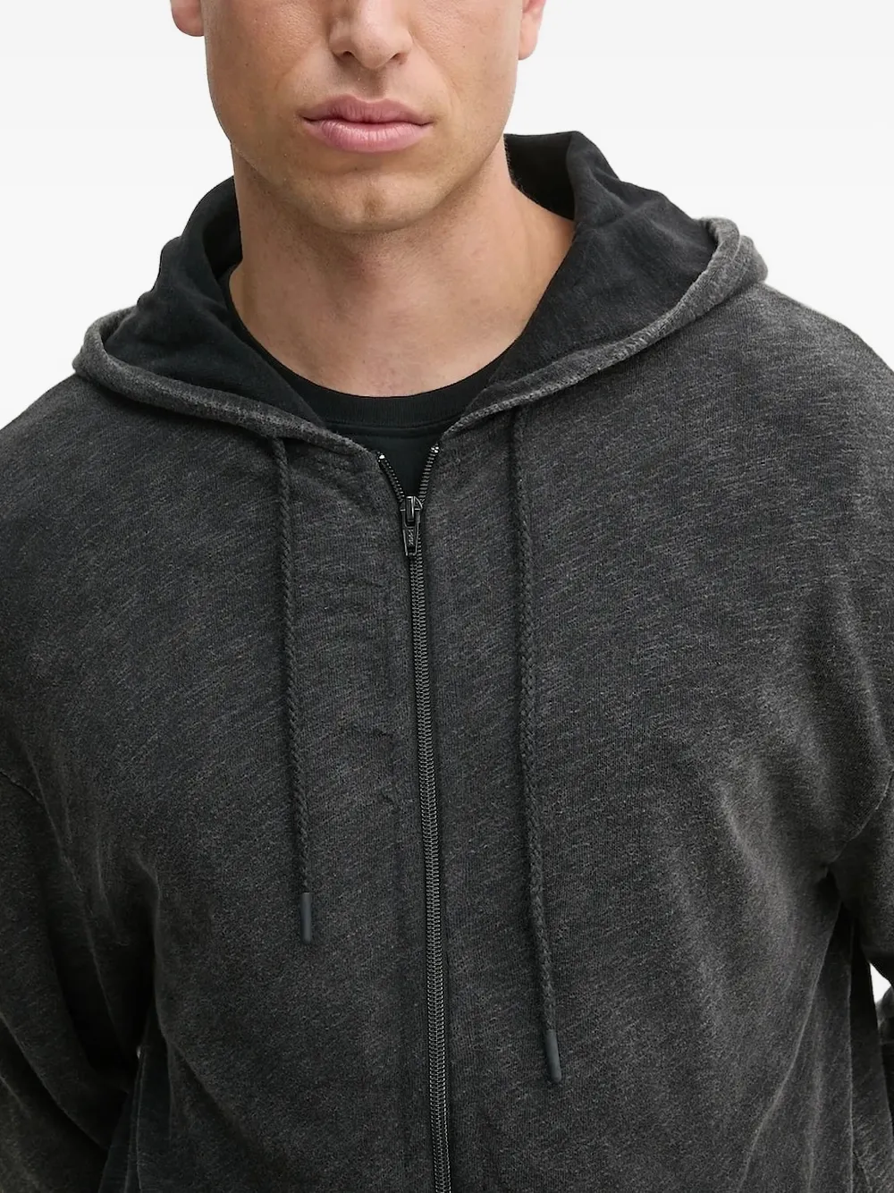 Темно-серый, застежка-молния по всей длине, капюшон на шнурке, длинные рукава