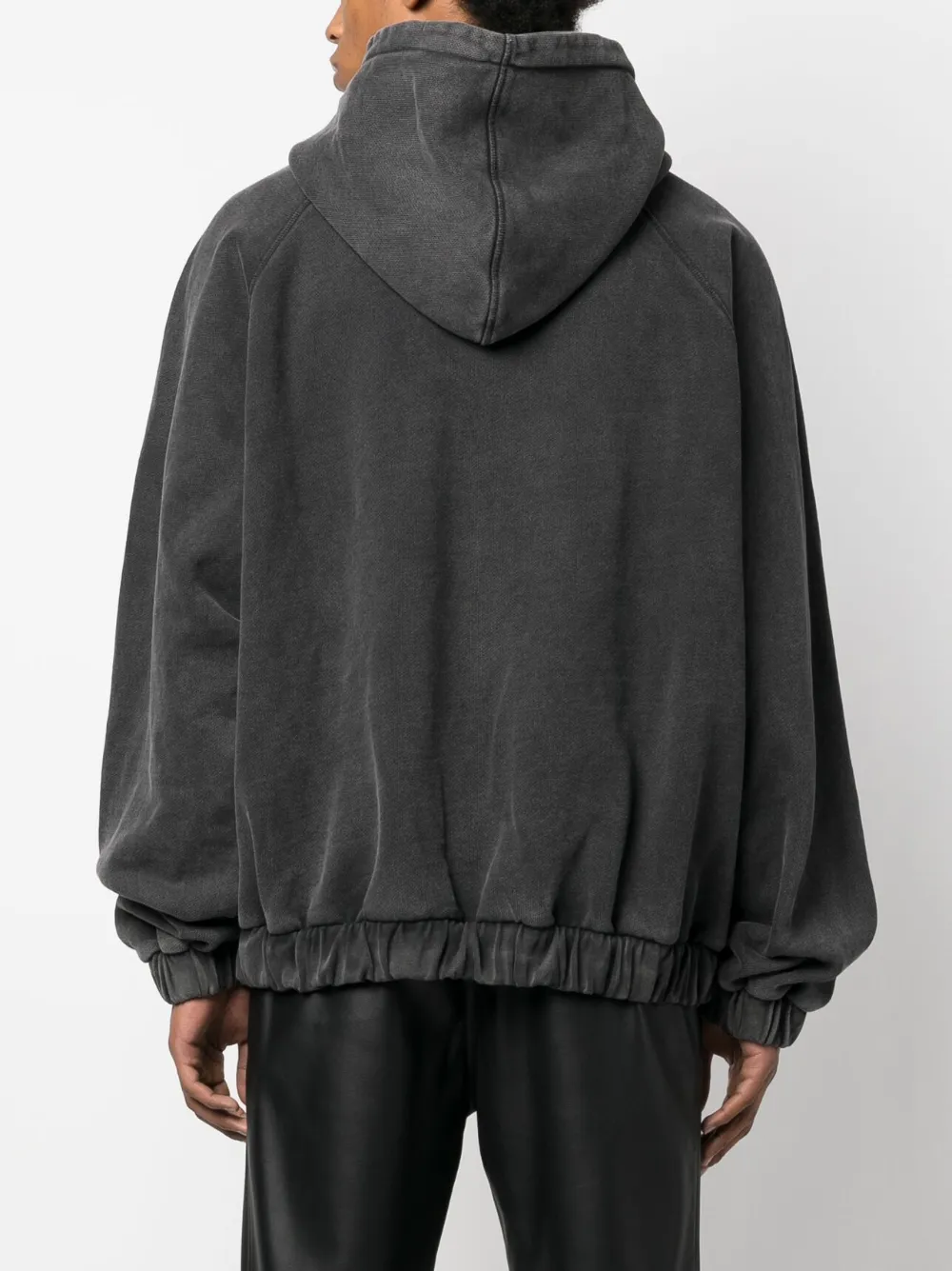 Черный, хлопок, эффект потертости, логотип спереди, объемный капюшон, застежка на молнии спереди, карман-муфта, удлиненные рукава и эластичный подол.