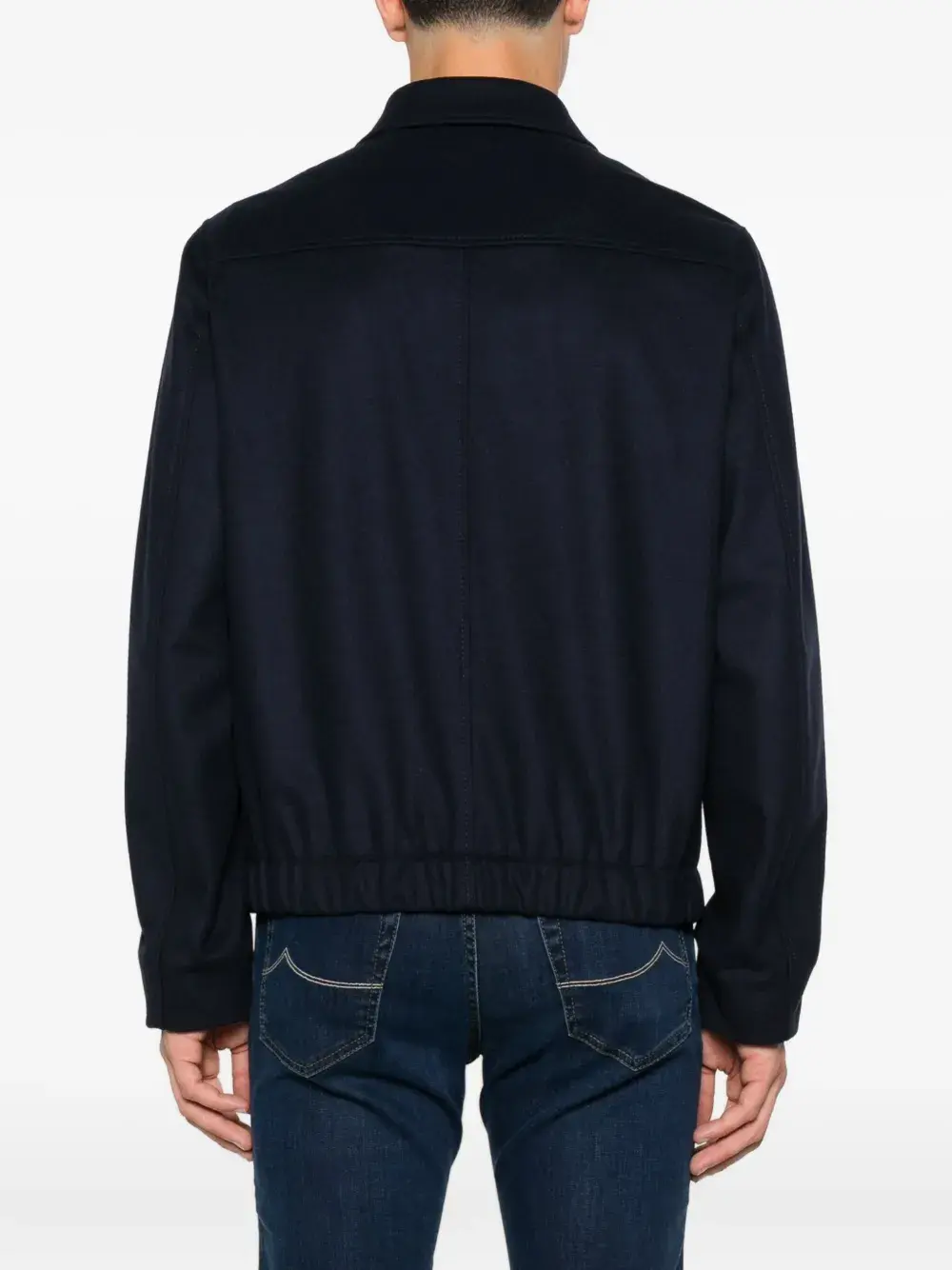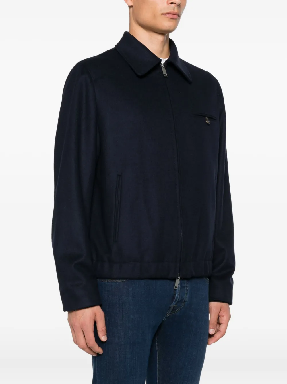 Двусторонняя застежка-молния из смесовой шерсти темно-синего цвета, прорезной карман, эластичный подол, воротник-стойка