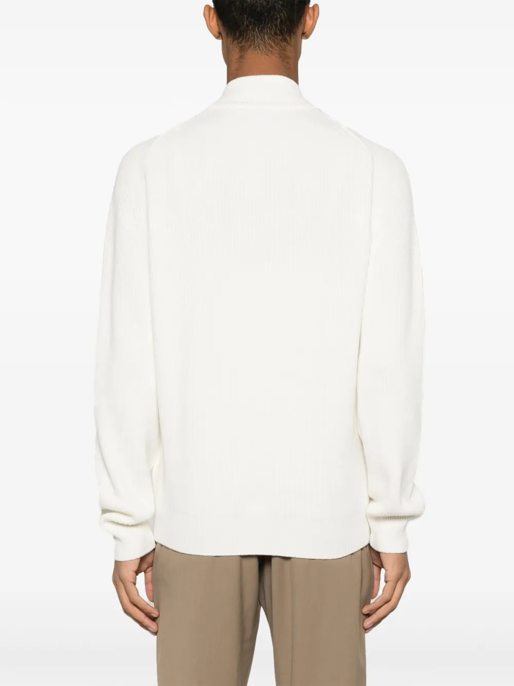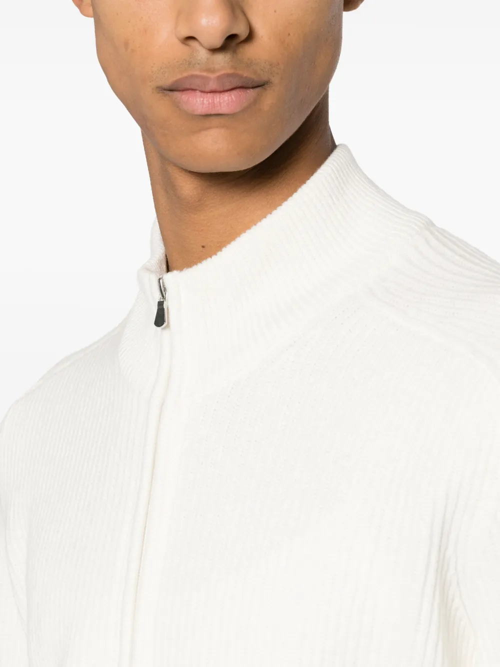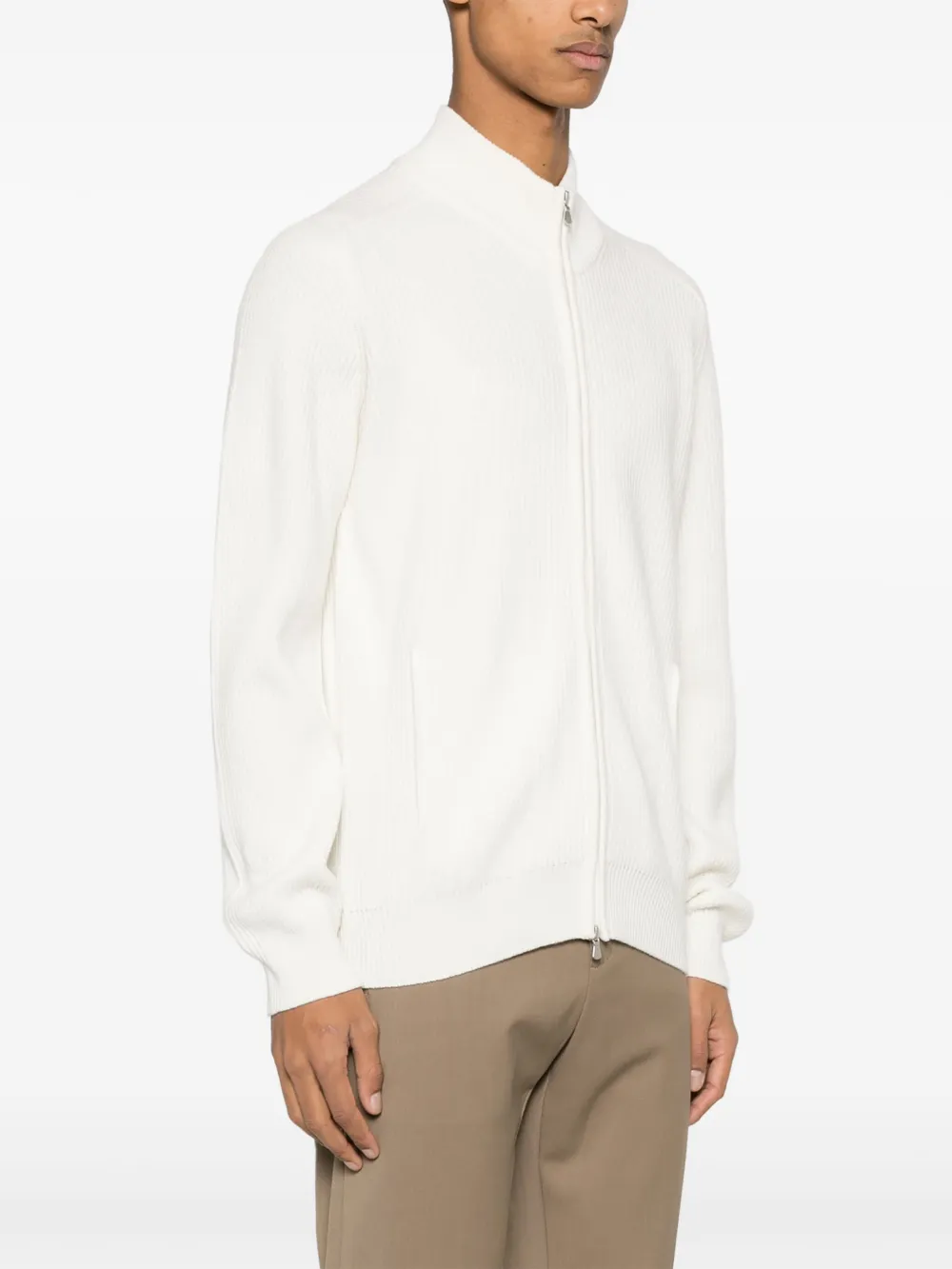 Белый, смесовая необработанная шерсть, трикотаж в рубчик, прорезные карманы по бокам, застежка на молнии спереди, высокий воротник, длинные рукава и прямой подол.