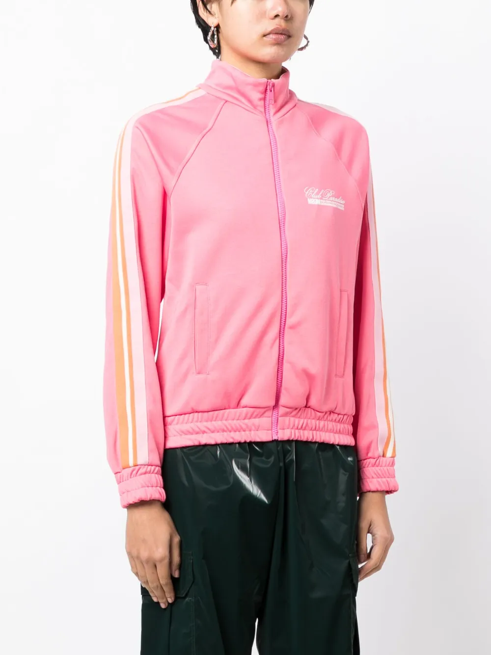 Нежно-розовый, разноцветный, полоска сбоку, принт с логотипом на груди, принт с логотипом сзади, высокий воротник, застежка на молнии спереди, рукава реглан, эластичные манжеты, два прорезных кармана сбоку, эластичный подол и прямой подол.