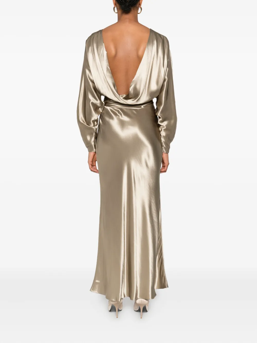 Песочного цвета, длинные рукава, вырез-лодочка, открытая спина, завязывающаяся панель, свободный покрой