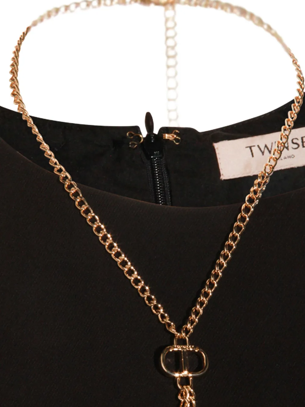 Черный фасон без рукавов, круглый вырез горловины, золотистая цепочка, застежка-молния, А-образный силуэт