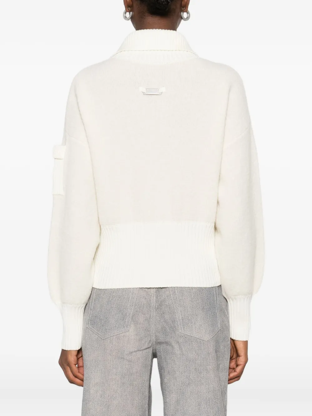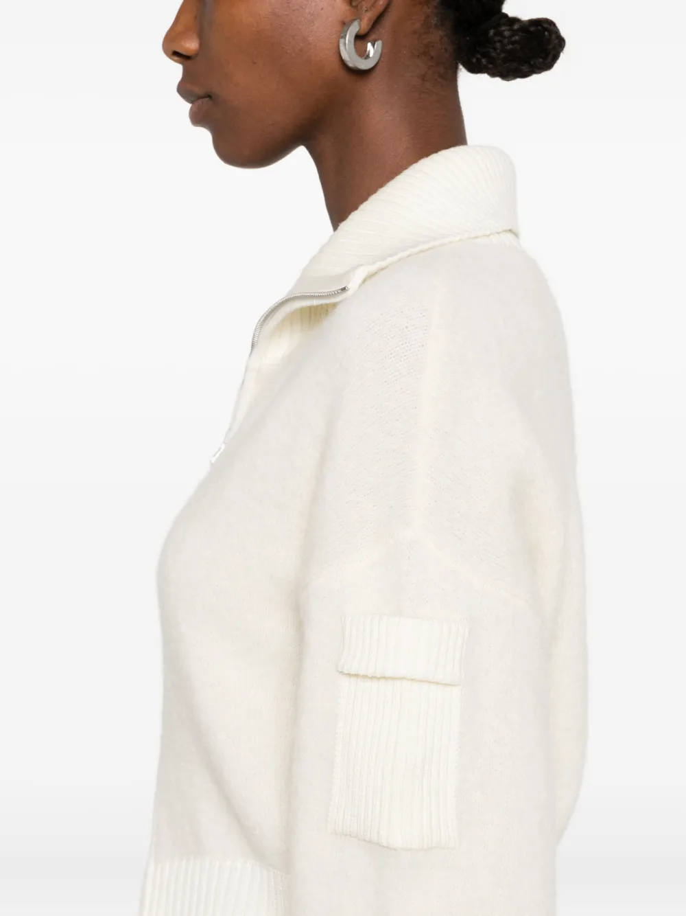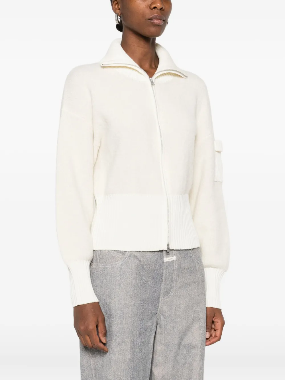 Молния белого цвета спереди, длинные рукава, ребристый подол рукава, накладной карман
