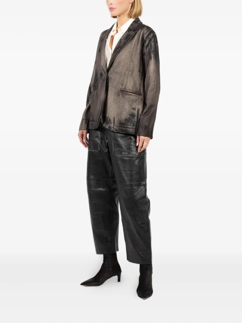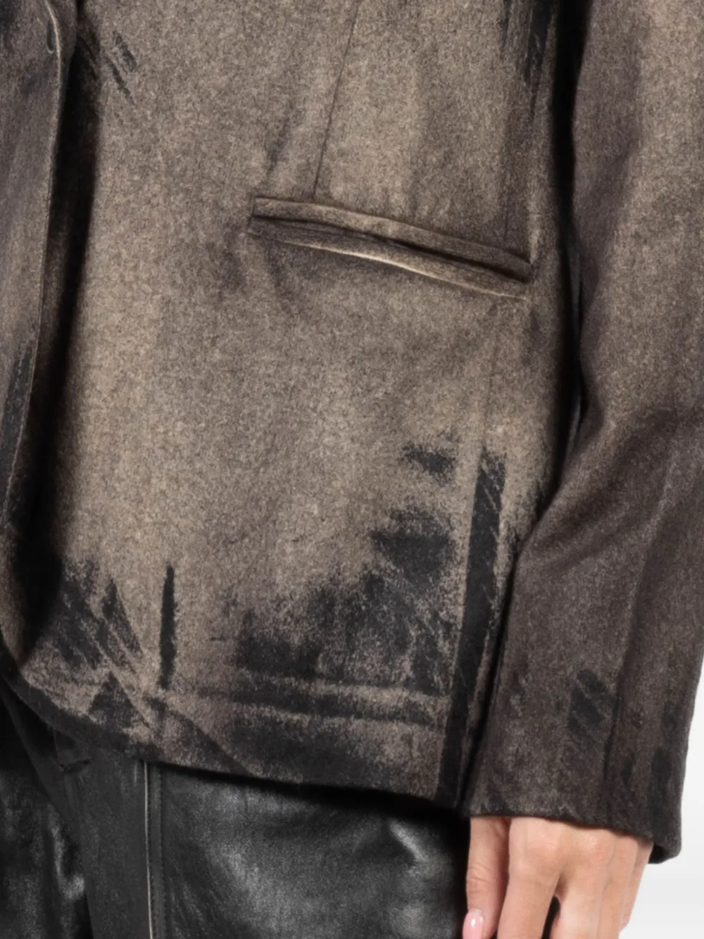 Серый абстрактный принт, однобортный пиджак, застежка, прорезные карманы, зазубренные лацканы, длинные рукава.