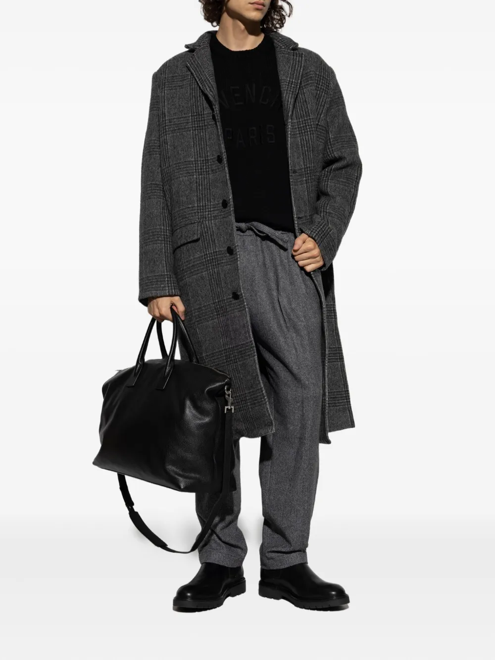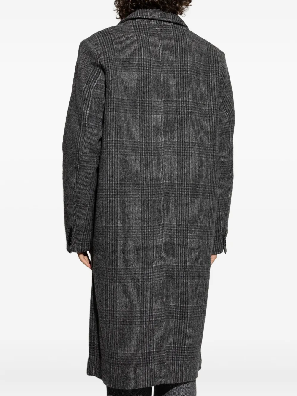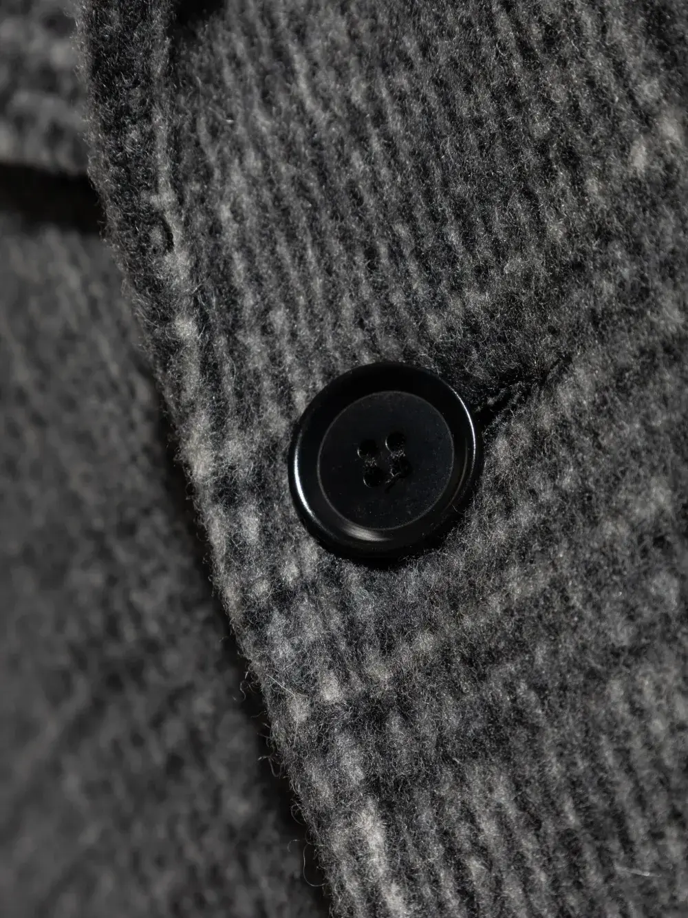Серый клетчатый узор, застежка на пуговицы, отвороты с зазубринами, прорезные карманы, длинные рукава.