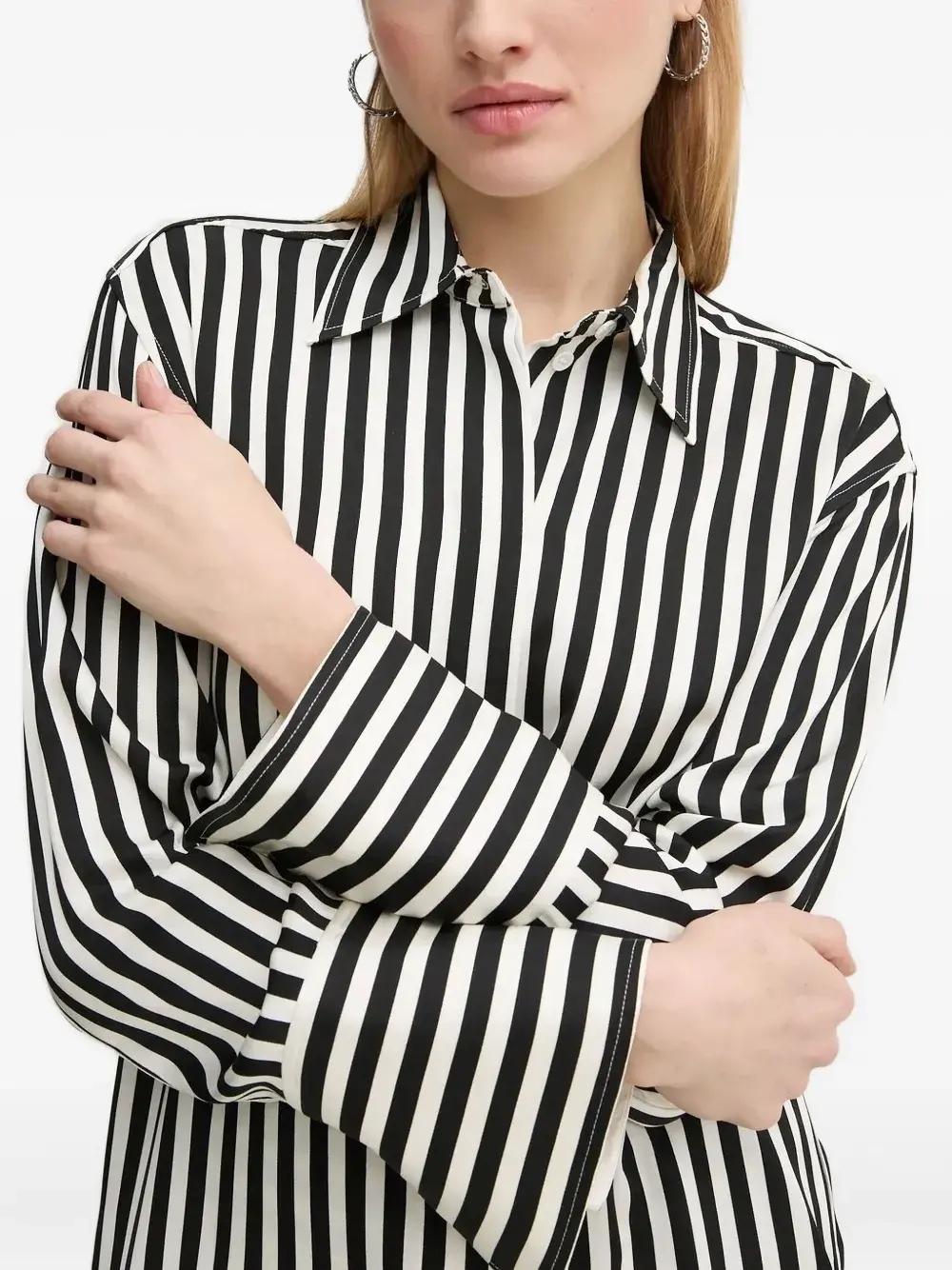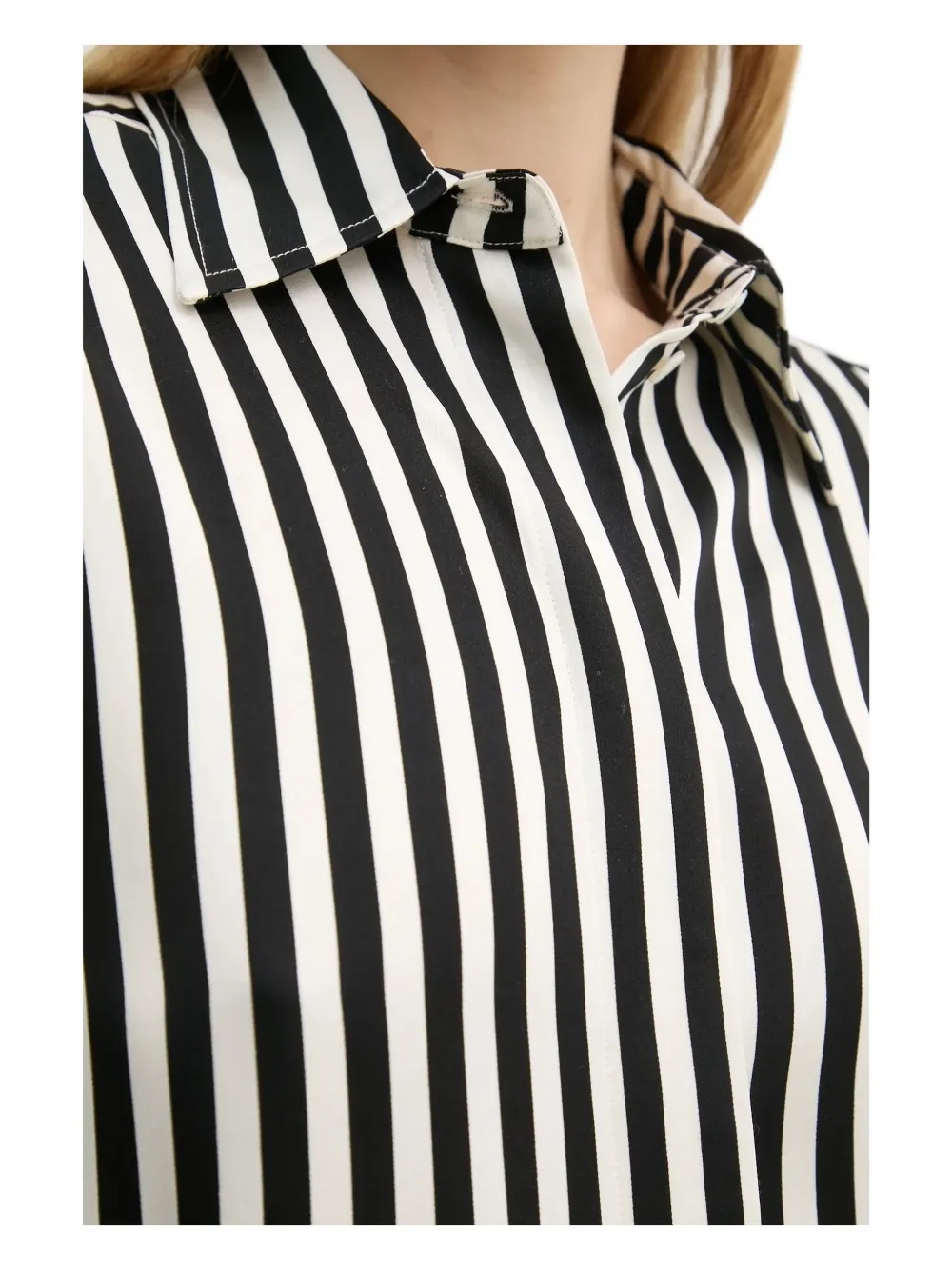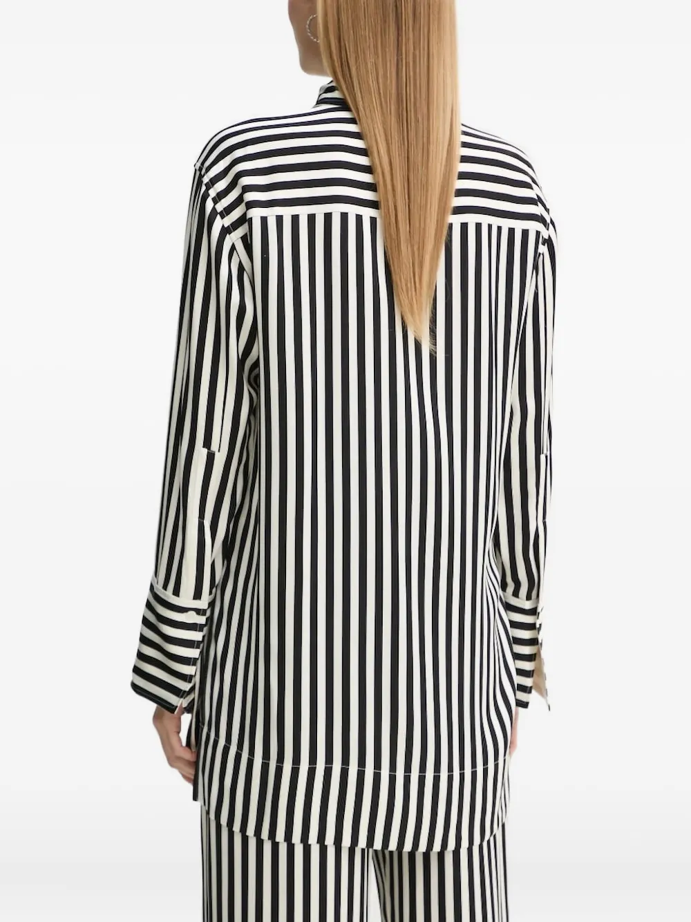 Черно-белые полоски, застежка на пуговицы спереди, длинные рукава, манжеты на пуговицах.