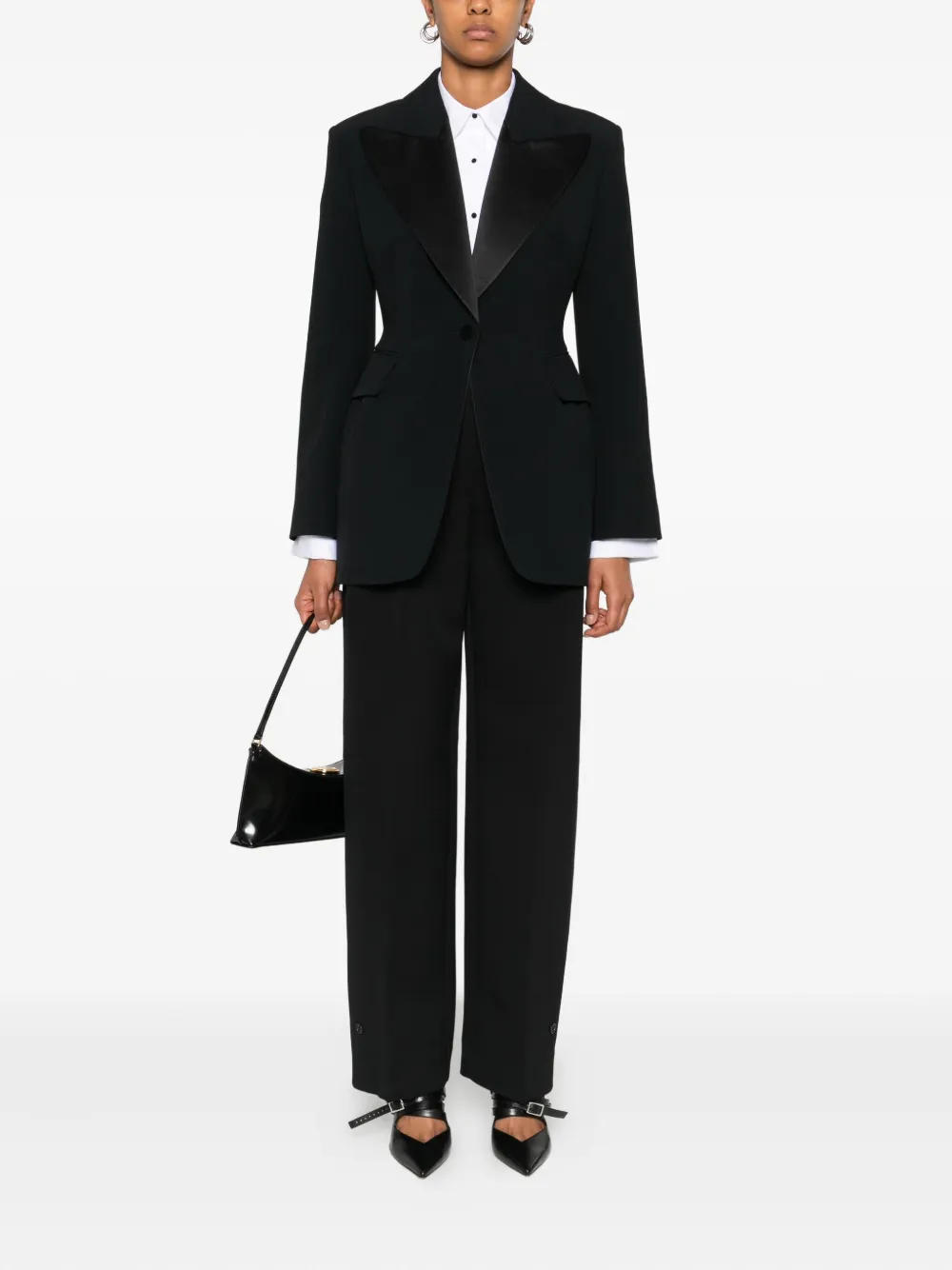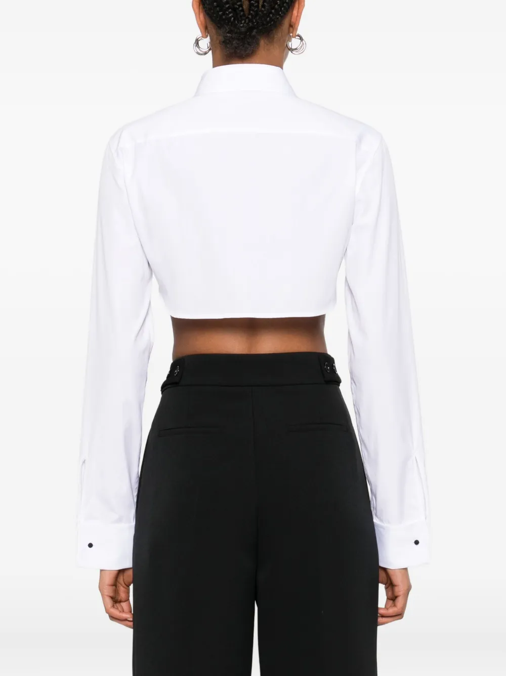 Белый хлопок, укороченный подол, длинные рукава, воротник, застежка на пуговицы.