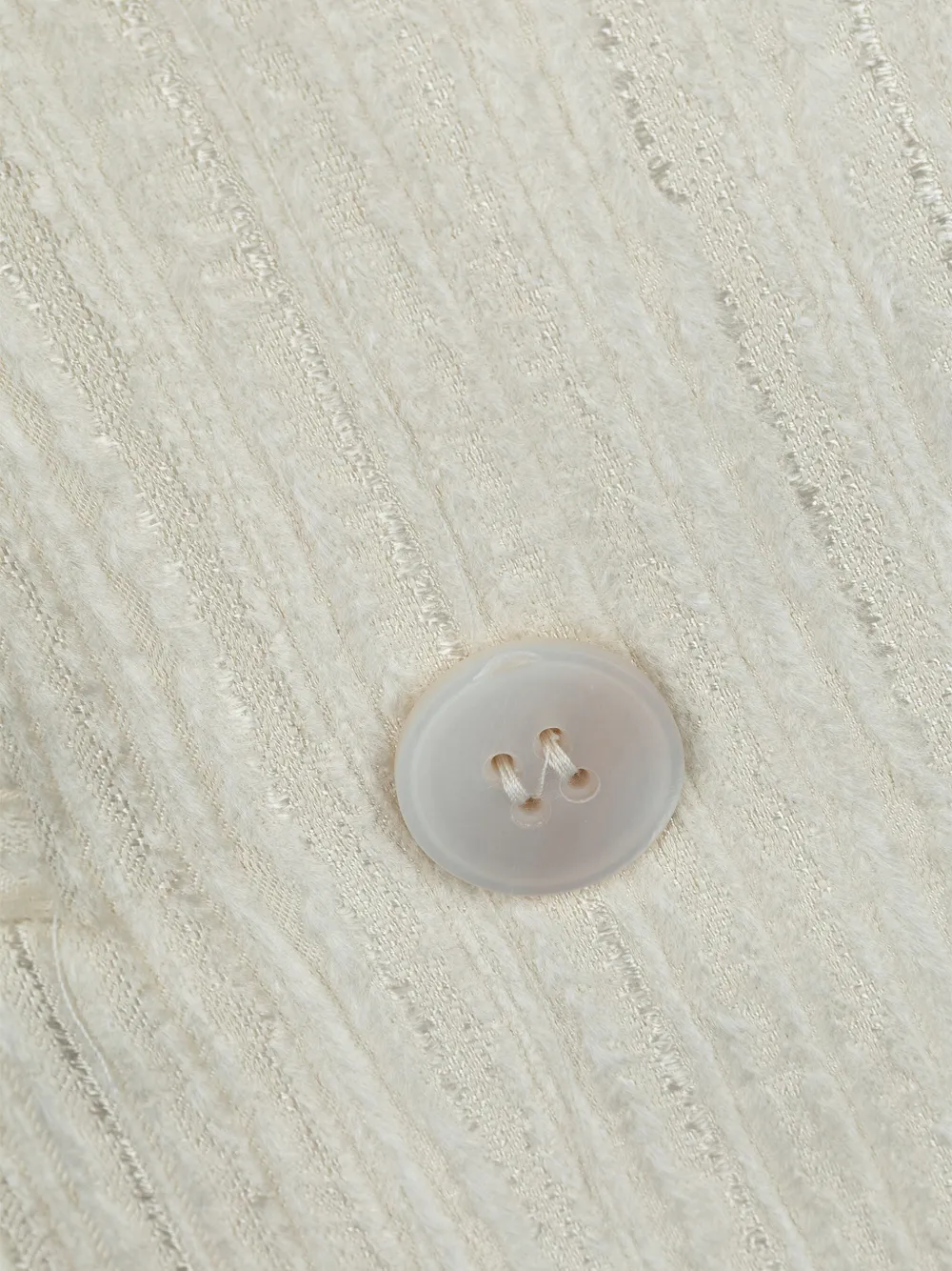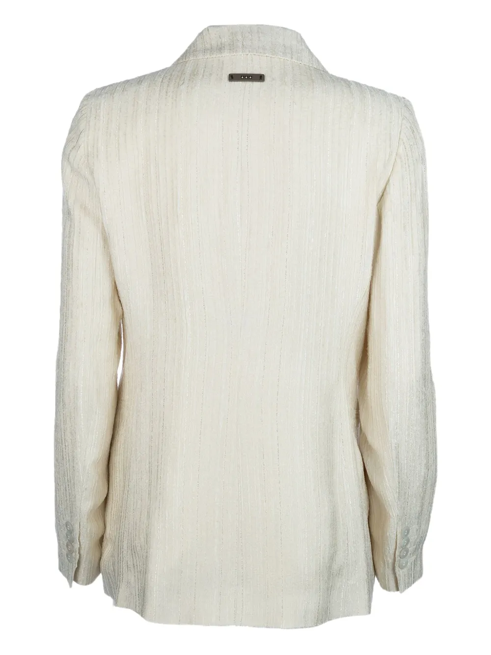 Двубортный пиджак бежевого цвета с застежкой на пуговицы, прорезными карманами и длинными рукавами.