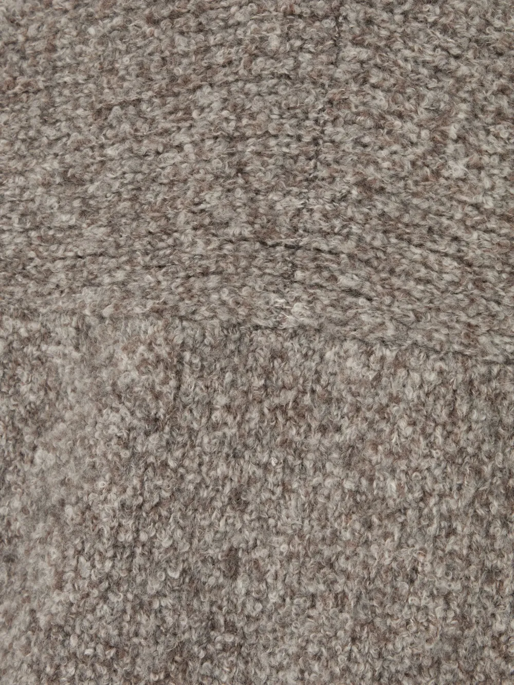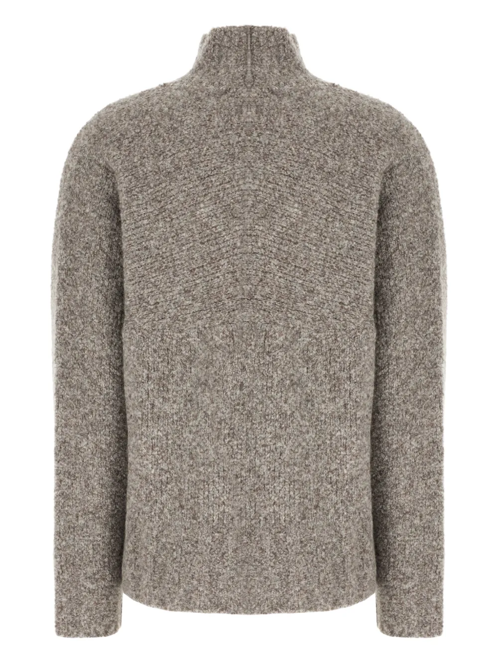 Серый меланжевый фактурный трикотаж с высоким воротом и длинными рукавами.