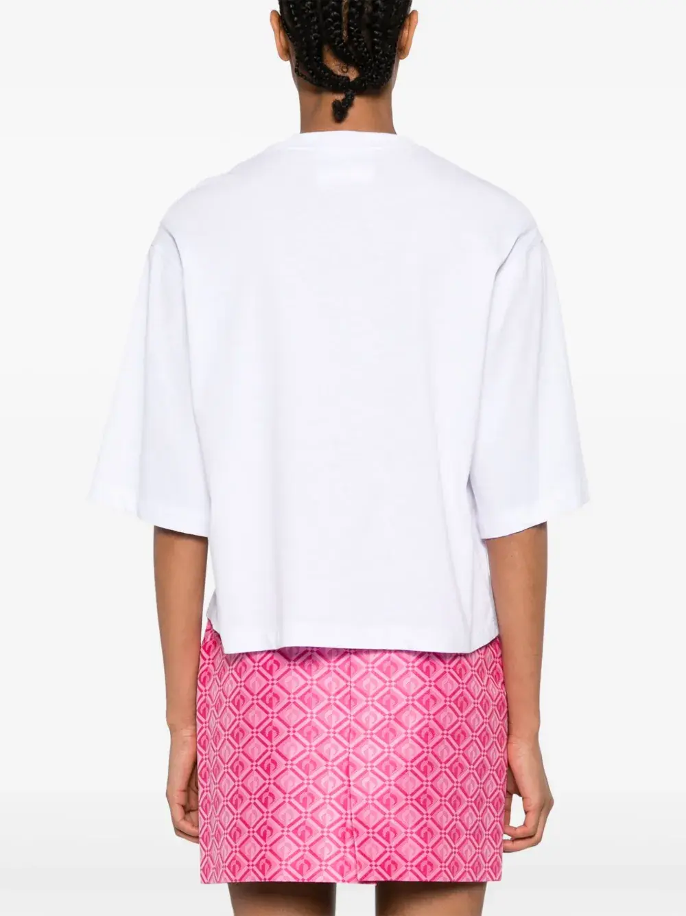 Белый, хлопок, ткань джерси, логотип спереди, блестящий материал, круглый вырез, приспущенные плечи, короткие рукава и прямой подол.