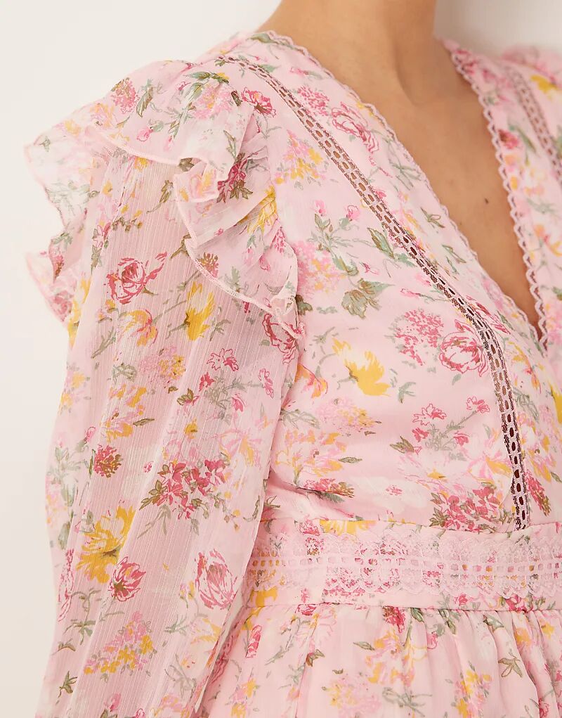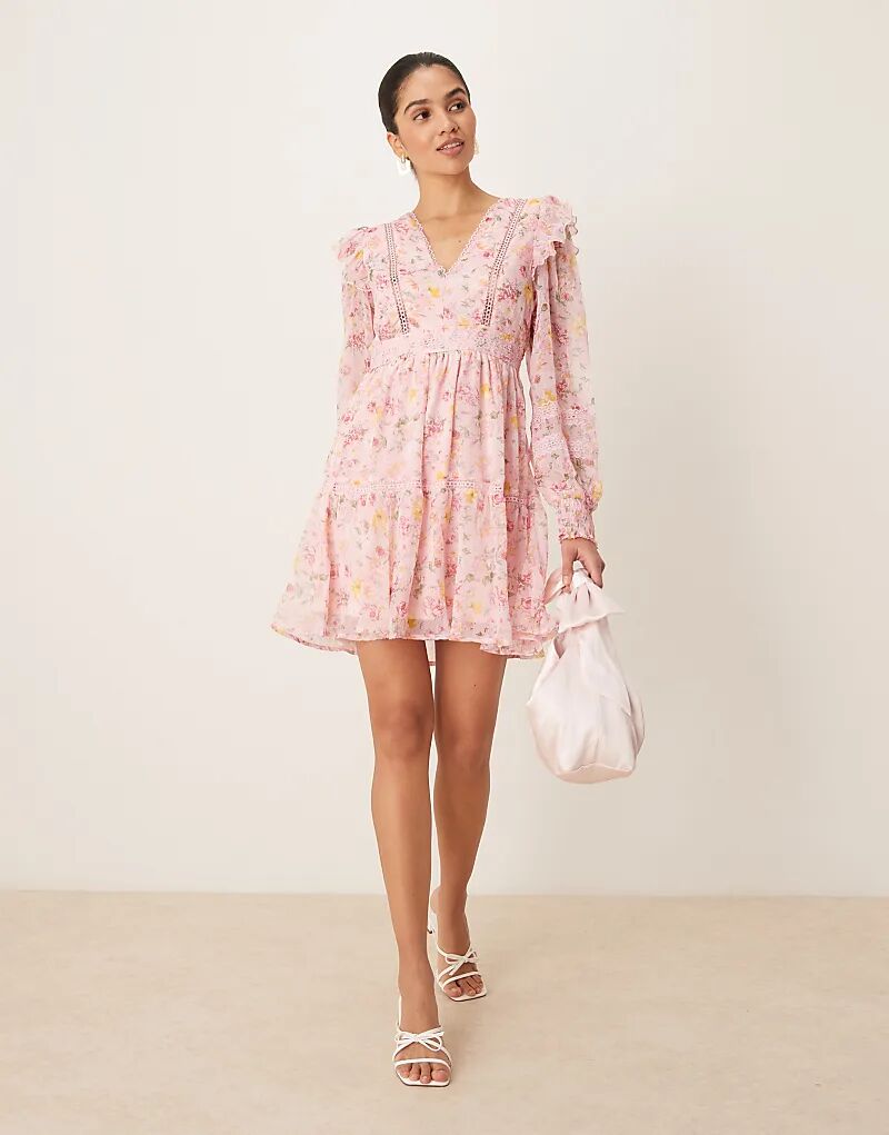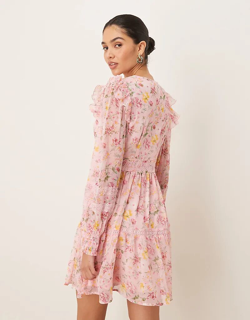 Мини-платье VILA с кружевом-лестницей и оборкой в персиковом цветочном узоре