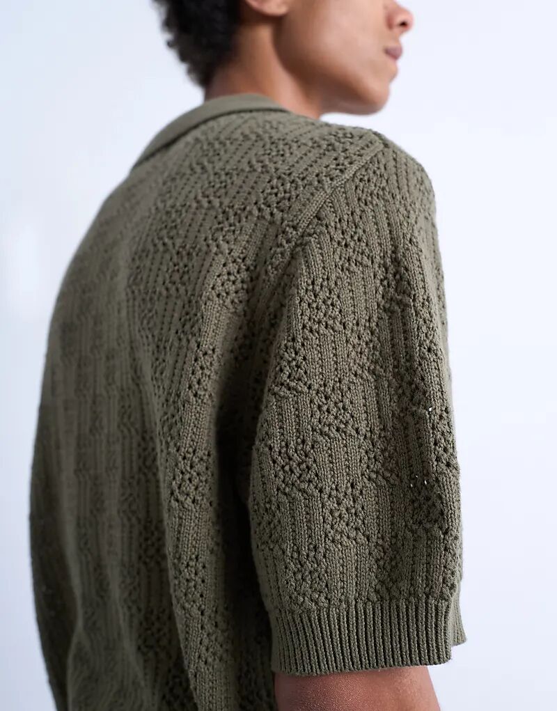 Эта рубашка-поло связана крючком в клетку. Имеет отложной воротник, короткие рукава, ребристую отделку и классический крой.