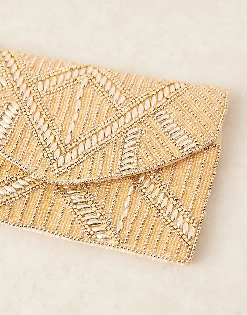 Клатч-конверт True Decadence с отделкой бисером и ремешком через плечо в золоте