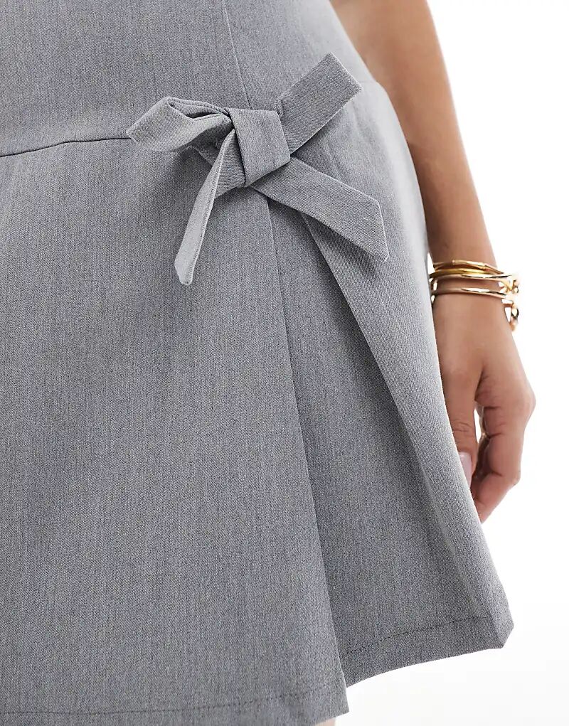 Гламурное мини-платье без бретелек с плиссированным бантом серого цвета