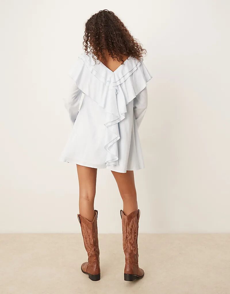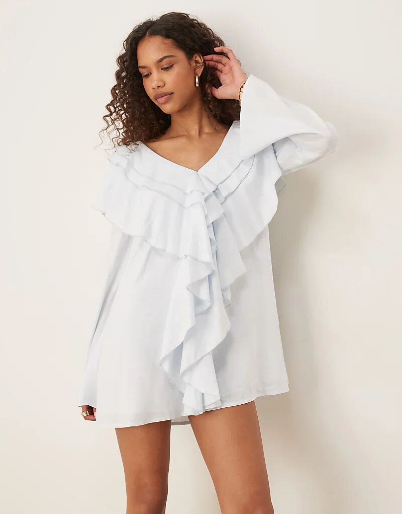 Мини-платье ASOS DESIGN с V-образным вырезом и оборками синего цвета