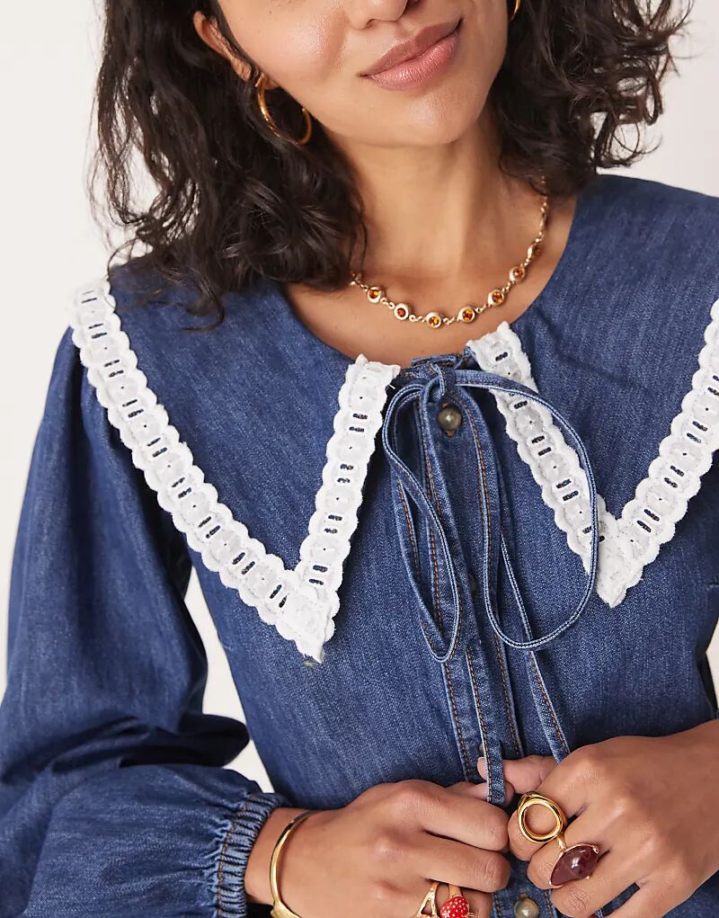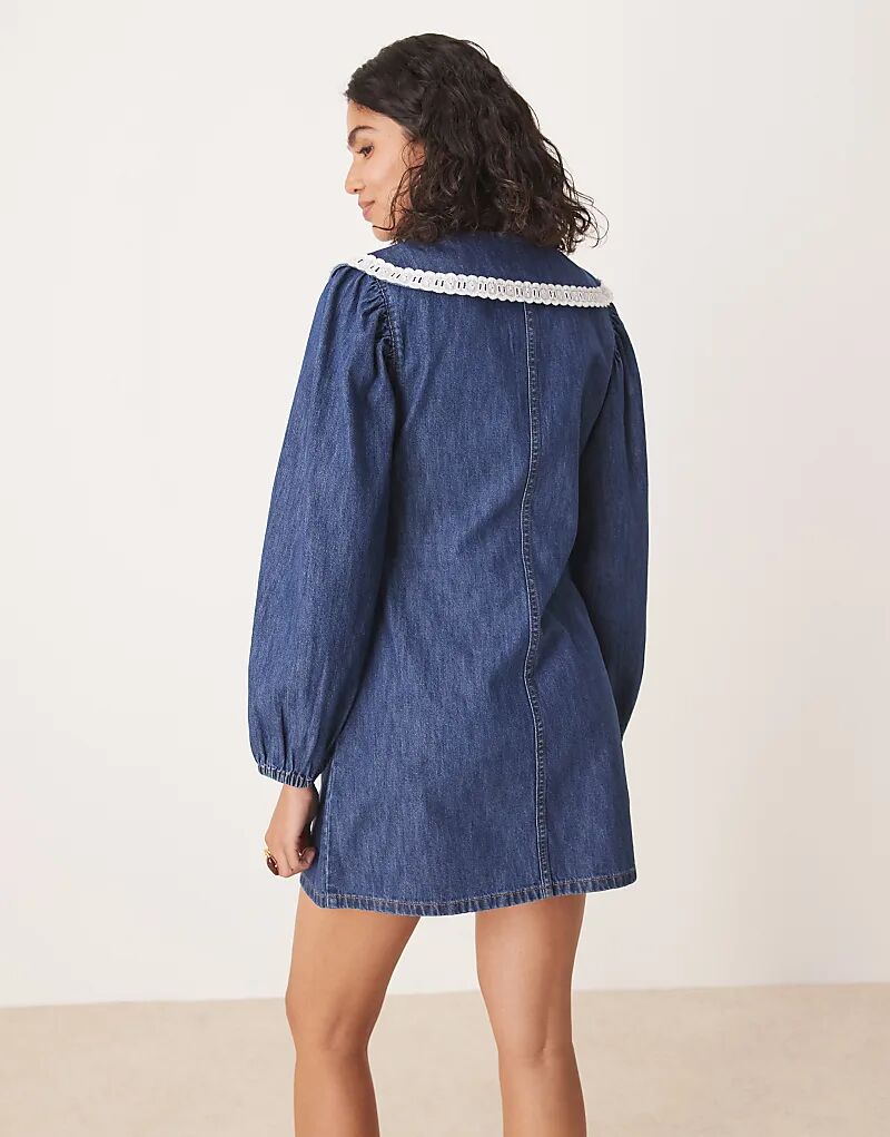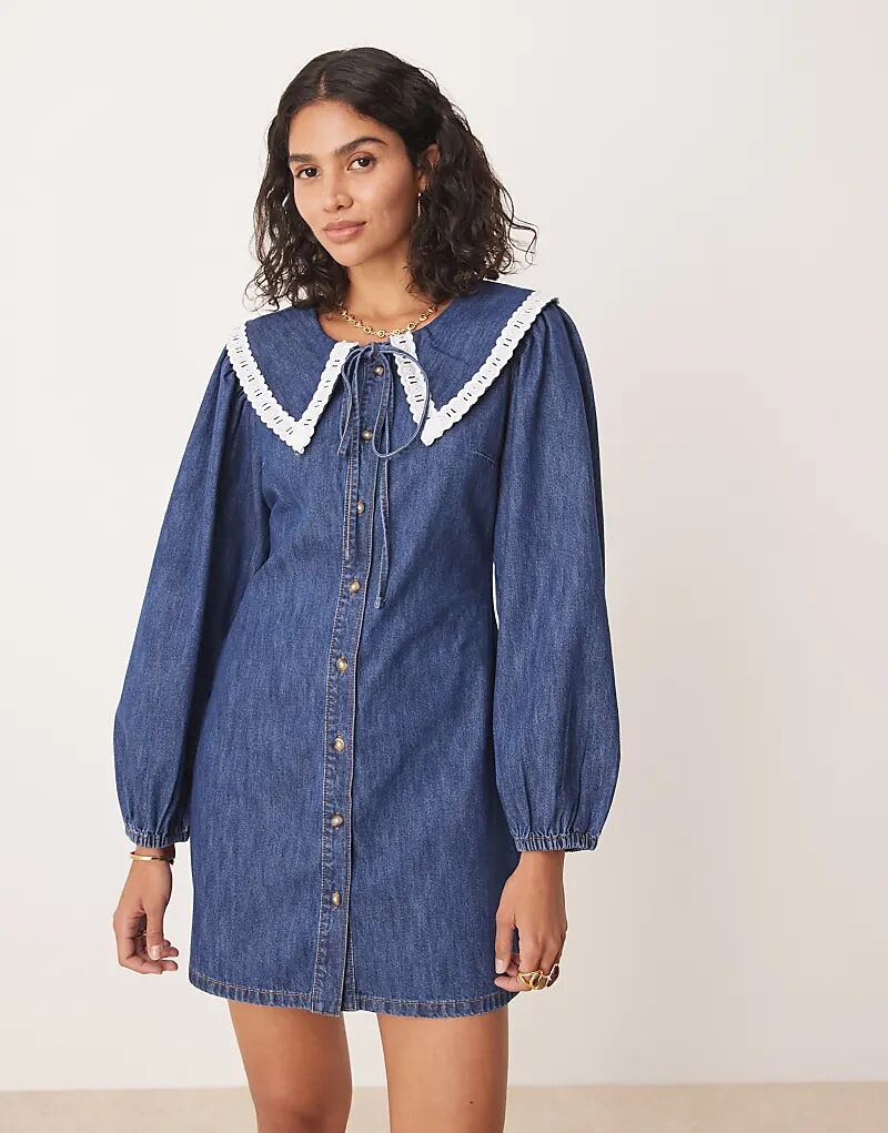 Джинсовое мини-платье ASOS DESIGN с длинными рукавами и воротником, средне-синего цвета