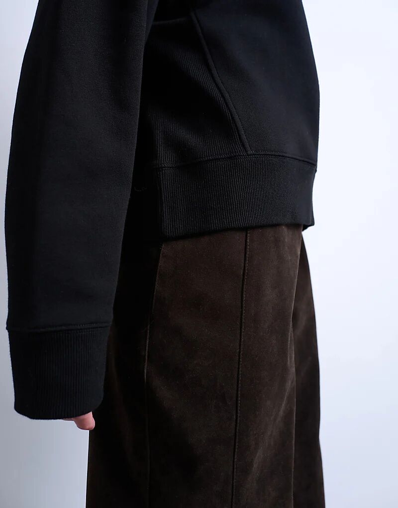 Эта толстовка выполнена из плотного джерси однотонного чёрного цвета. Модель имеет классический круглый вырез горловины и длинные рукава, классический крой, а также ребристые вставки и отделку для дополнительной фактуры.