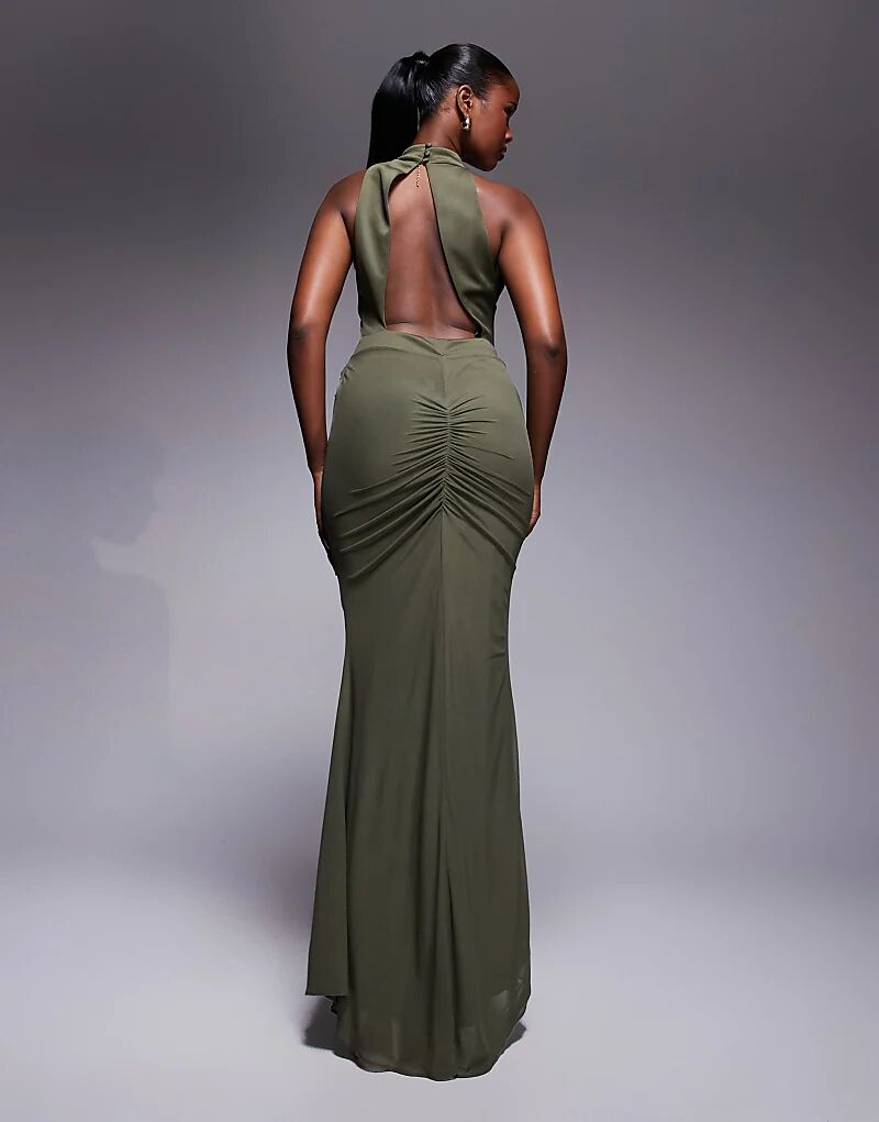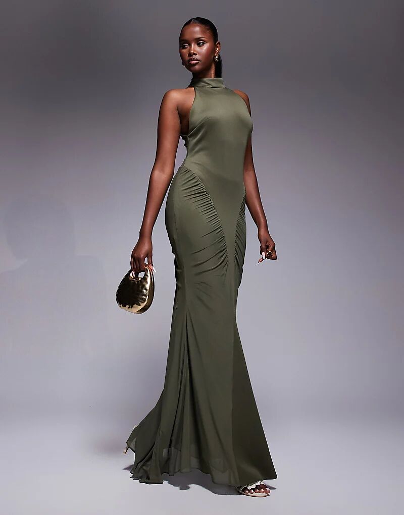 Платье макси ASOS DESIGN с высоким воротом и рюшами цвета хаки