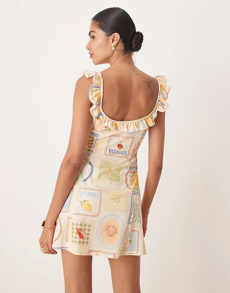 Мини-платье ASOS DESIGN с оборкой спереди и бретелями, с принтом открытки