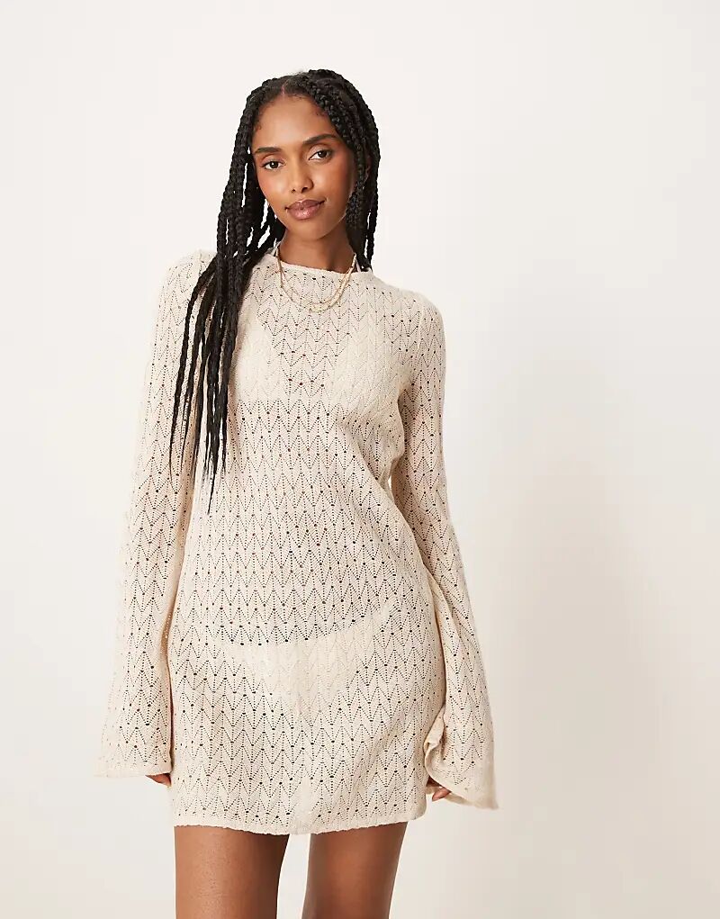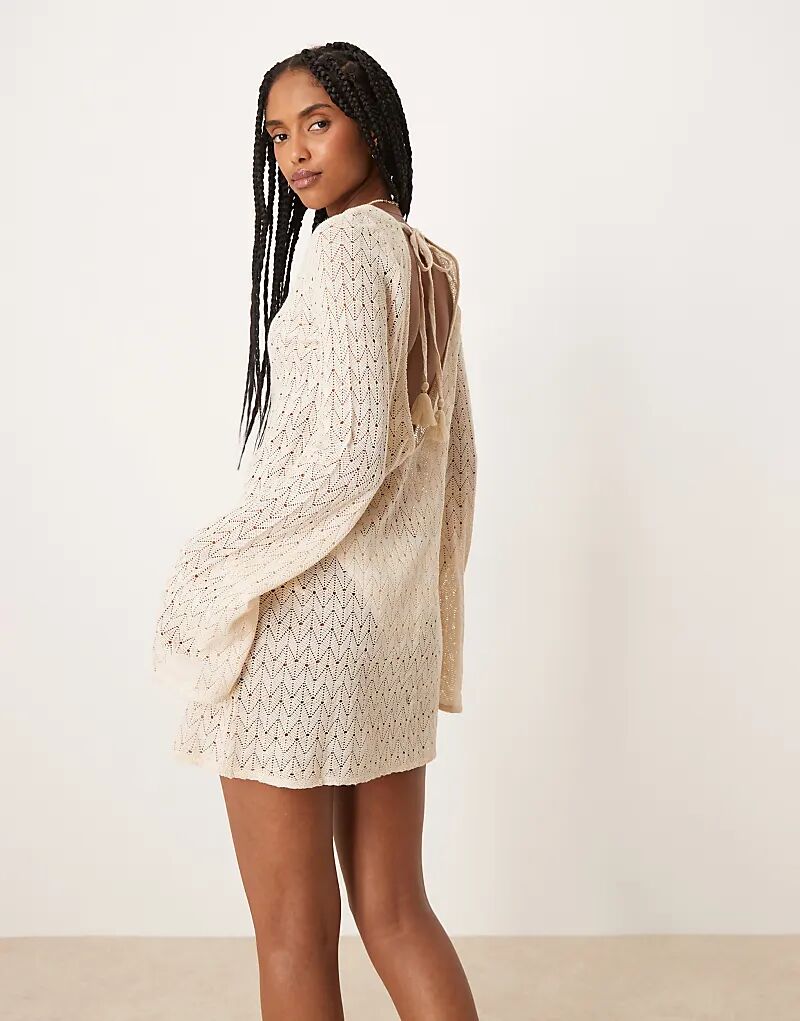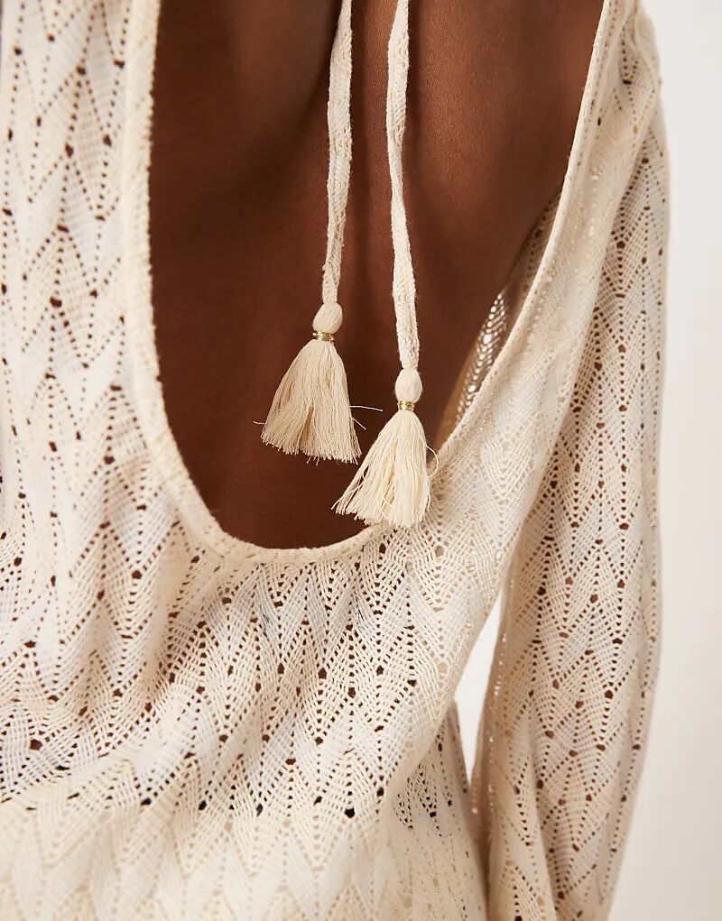 Пляжное мини-платье Aray, связанное крючком, бежевого цвета